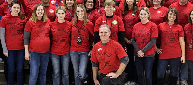 Dave Anderson, kneeling, poses with Monticello Trails Middle School teachers and staff members during a January blood drive at the school in Shawnee. Students and staff organized the drive in honor of Anderson, who recently battled leukemia and had to undergo a blood transfusion that helped get him on the road to recovery.
