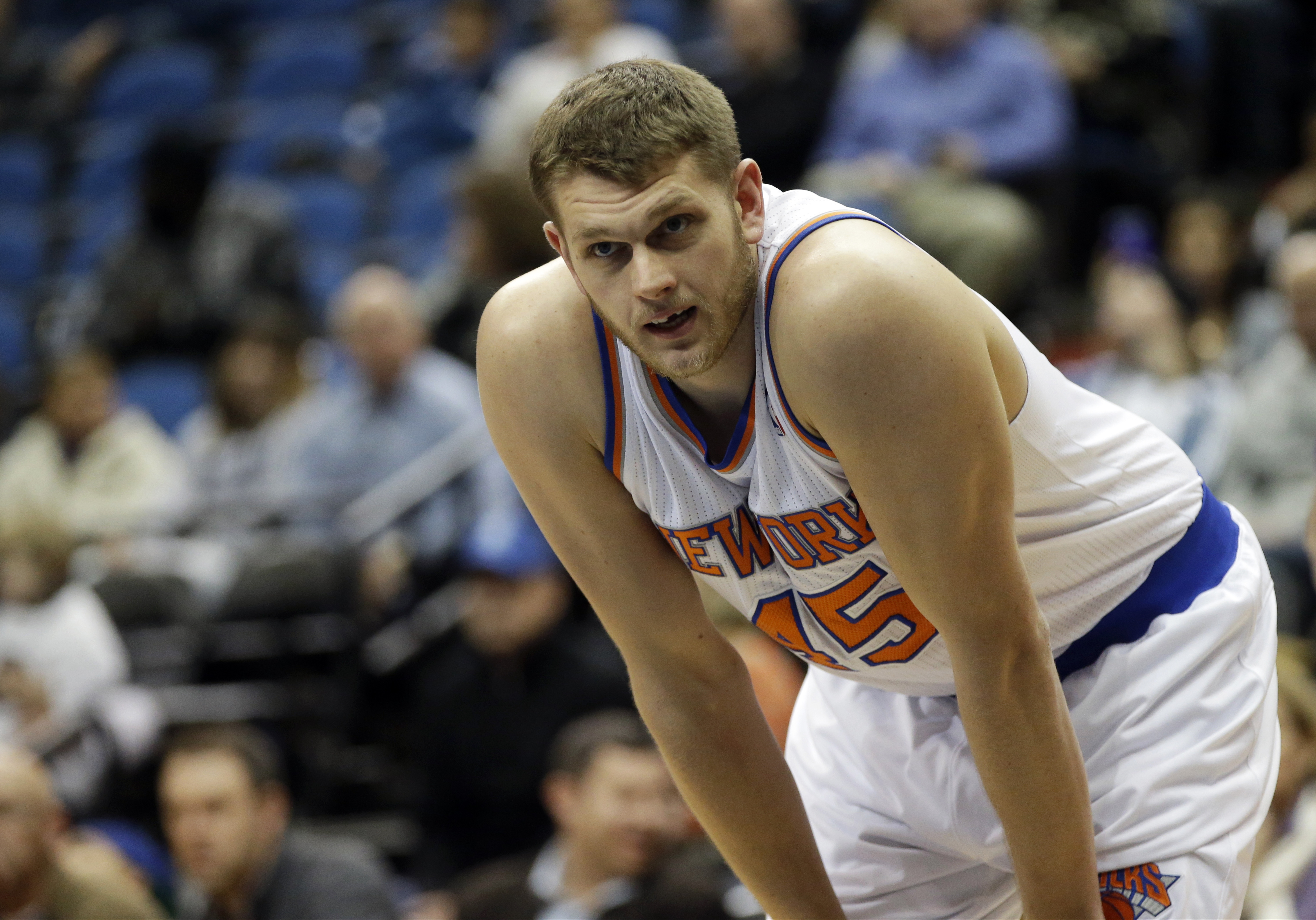 The Knicks’ Cole Aldrich takes a breather in New York’s game against the Timberwolves in this photo from March 5 in Minneapolis.