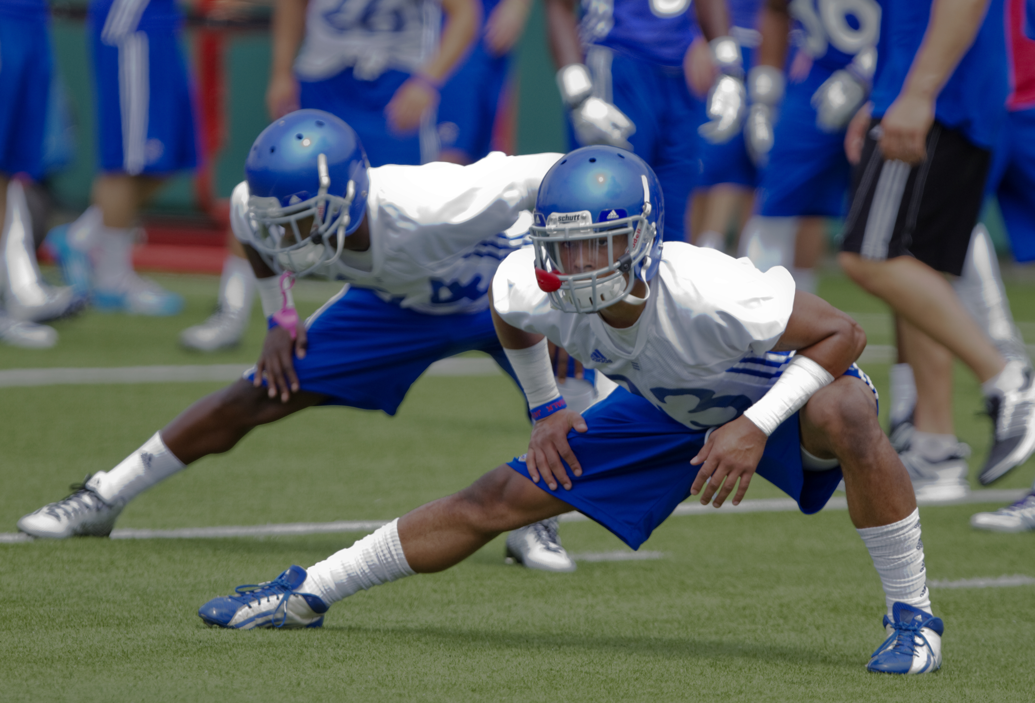 KU safety Cassius Sendish stretches out during the first KU football practice Friday, Aug. 8, 2014, on the football practice fields south of Memorial Stadium.