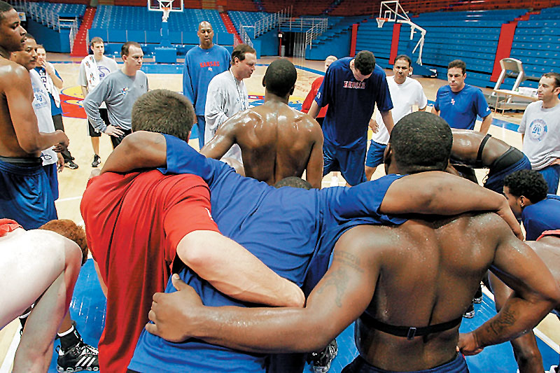 KU coach Bill Self huddles with the Jayhawks after a Boot Camp conditioning session in this file photo from 2006.
