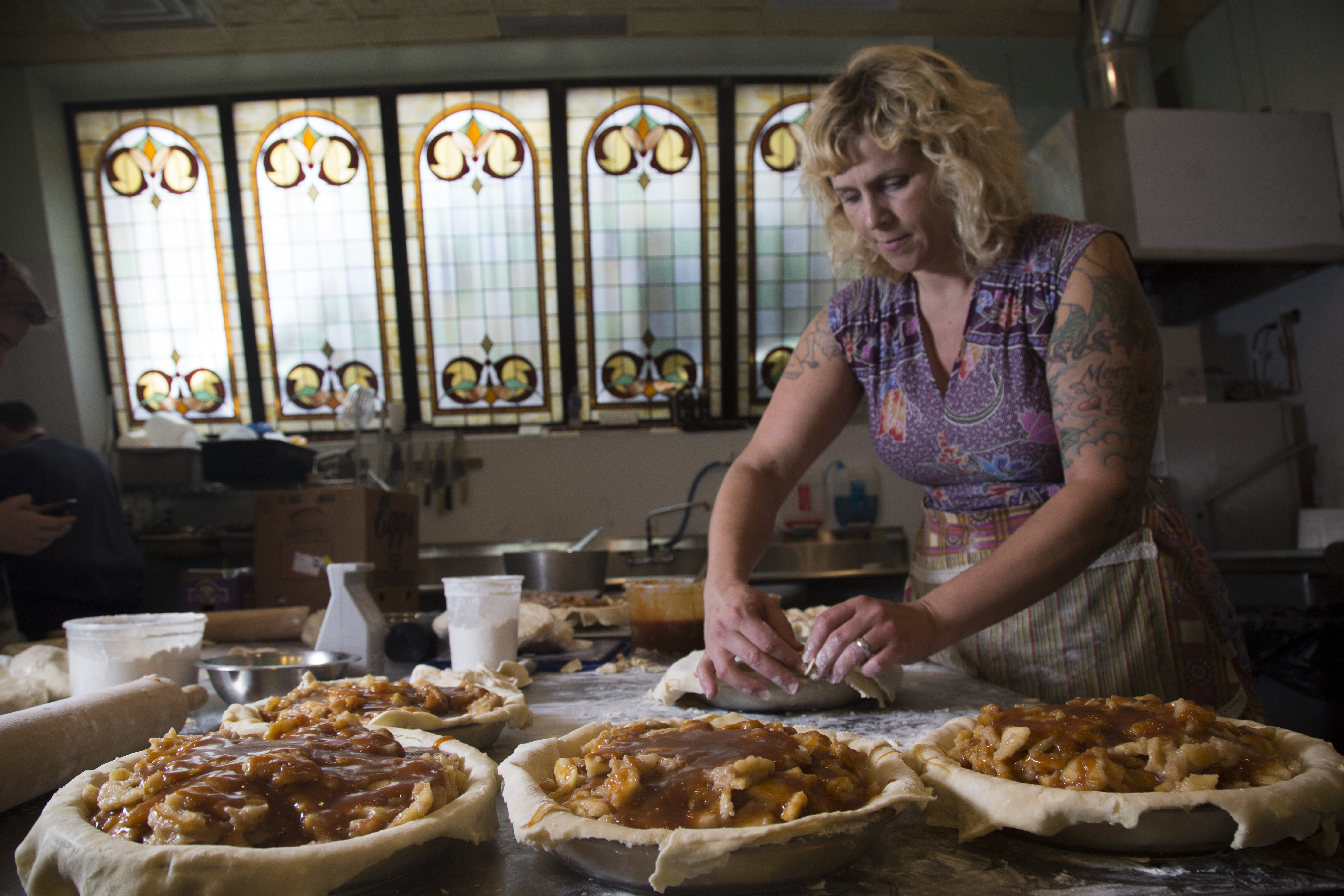 Ladybird Diner owner Meg Heriford prepares pies in the restaurant's prep kitchen, formerly the private dining room of Dynamite Saloon.