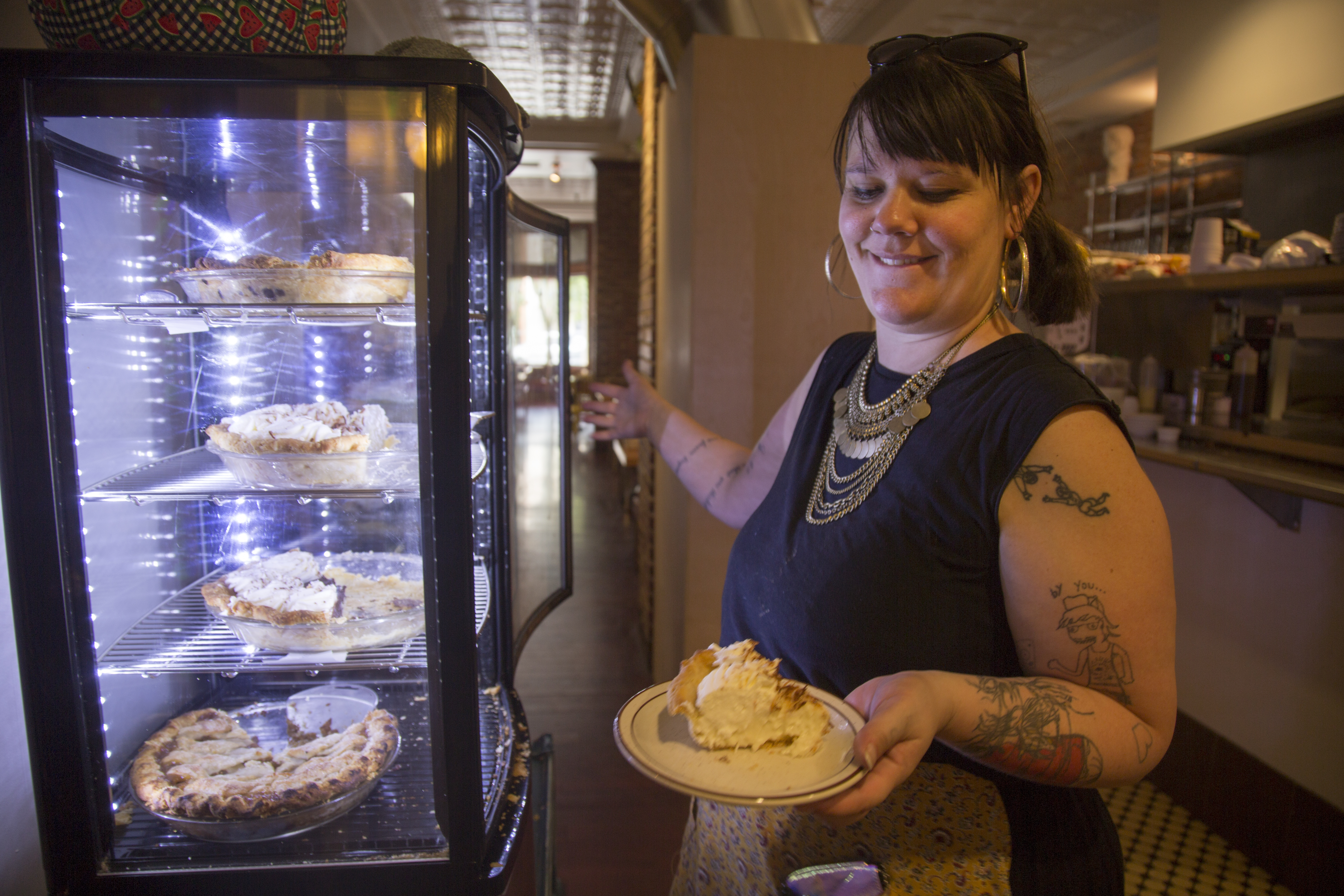 Lou Pulford delivers a slice of coconut cream pie to a customer at Ladybird Diner.