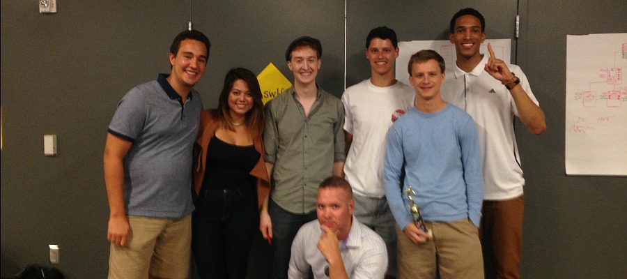 PhotoNote wins the first Lawrence Startup Weekend. The winners from left to right are Nick Brade, Megan Murphy, Zak Wohlschlegel, Dalton Jorns, Rhys Raglow and Anthnoy West. In the front row is Clay Westerlund.