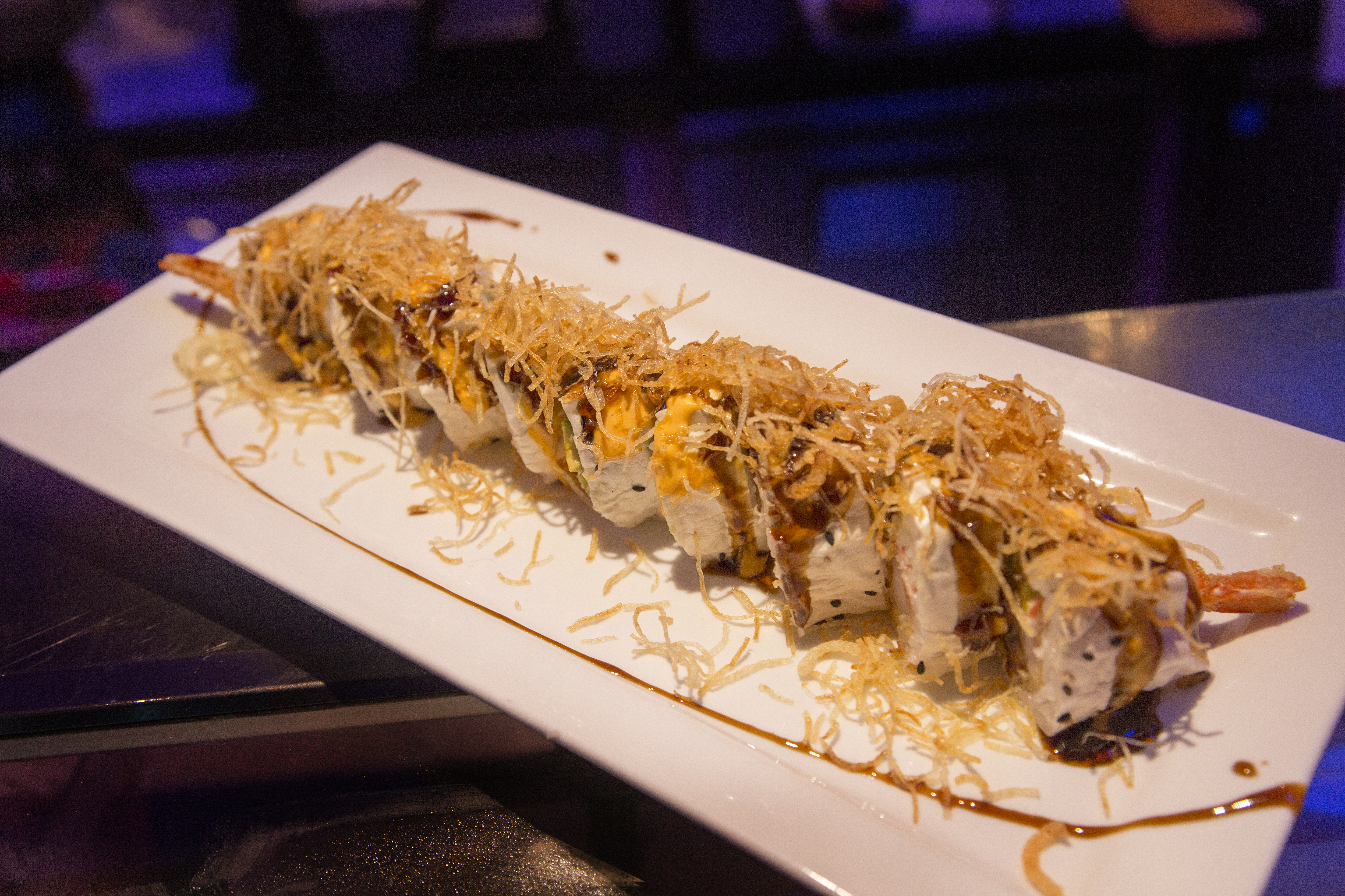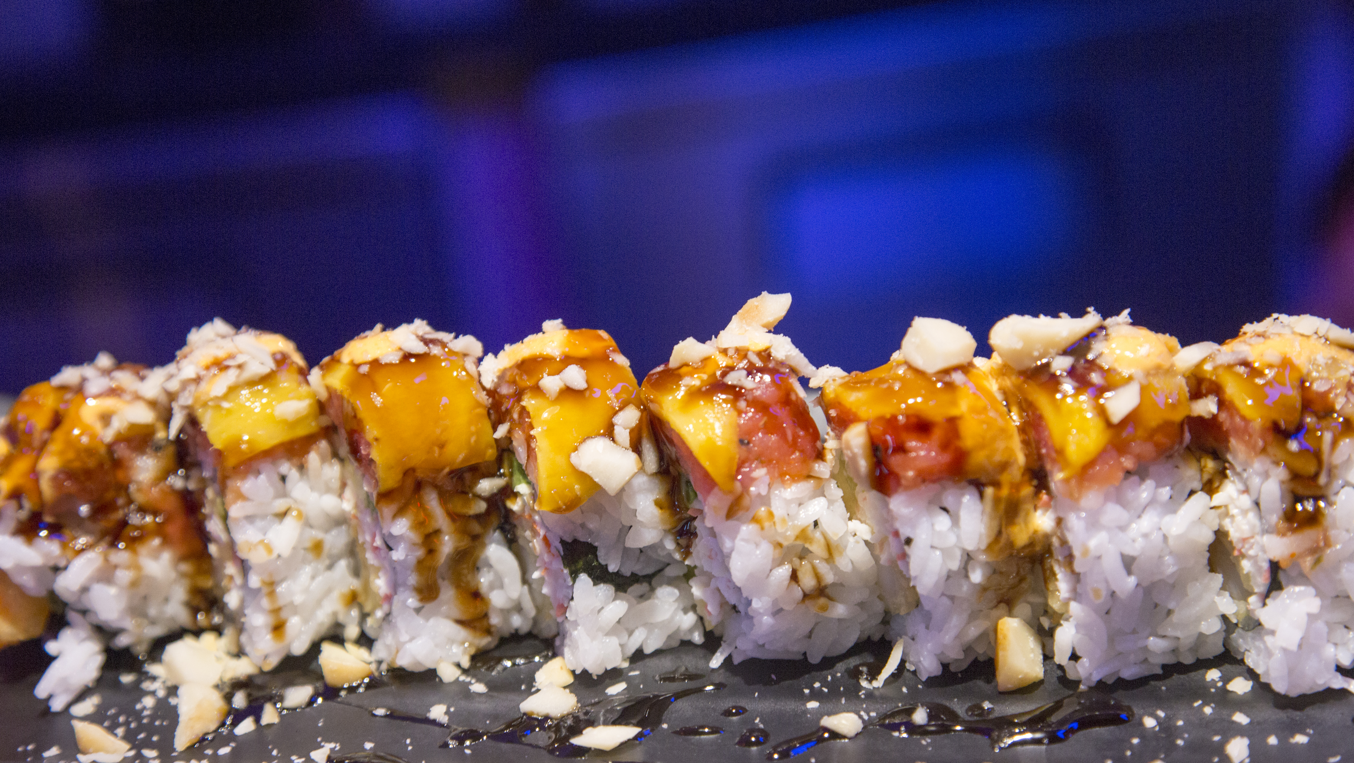 The Coconut Gigolo Roll with crab, avocado, mango and shrimp tempura is pictured at Prime Blu, 619 Massachusetts St. The sushi restaurant, which opened in downtown Lawrence in March, features colorful decor with lasers and flashing LED lights on top of its menu.