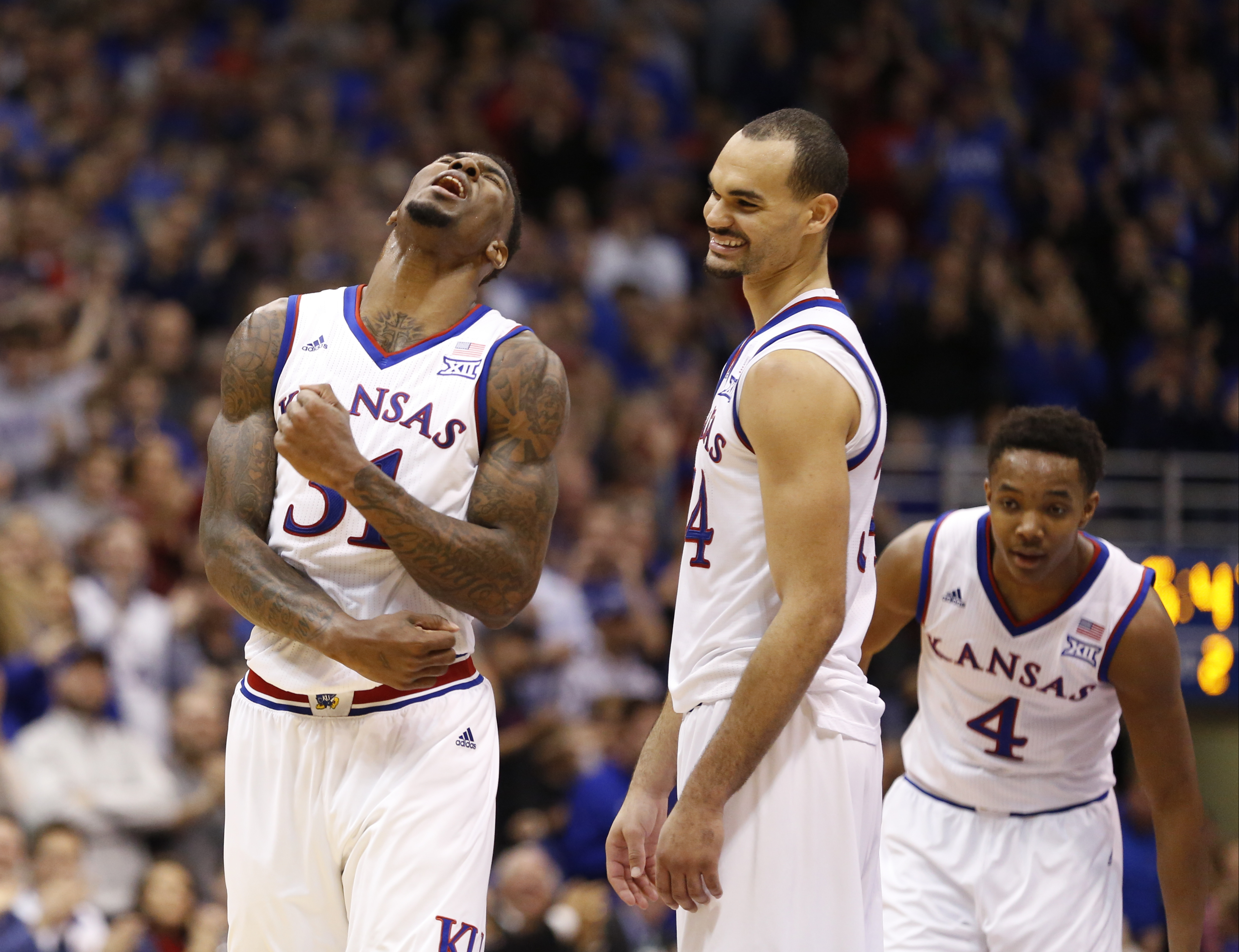 Kansas forward Perry Ellis (34) smiles as teammate Jamari Traylor, left, celebrates following Ellis' high-flying lob dunk during the second half, Saturday, Feb. 21, 2015 at Allen Fieldhouse.