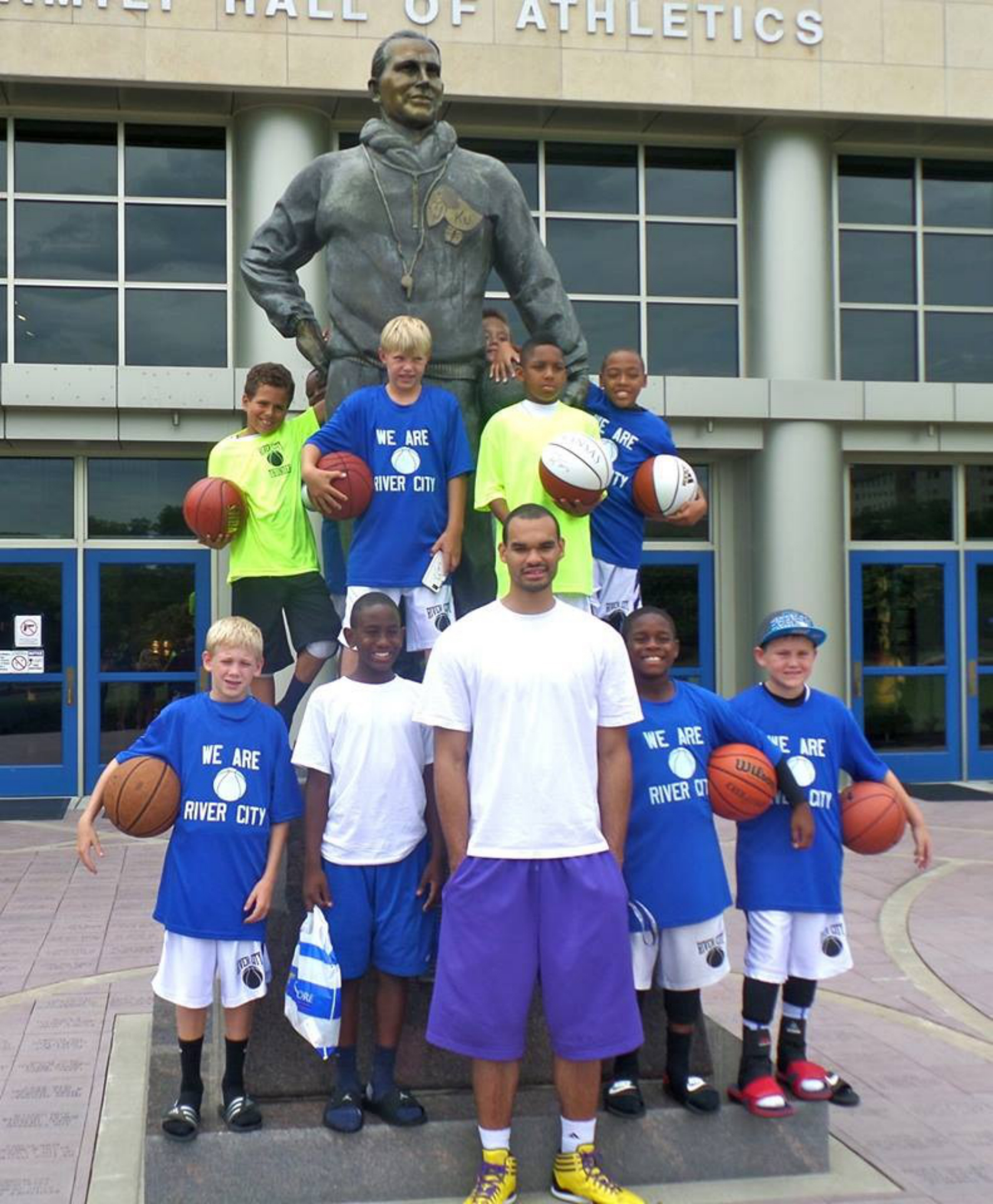 Kansas junior forward Perry Ellis poses with a group of youths from Wichita in front of Allen Fieldhouse. Ellis, a former Teen