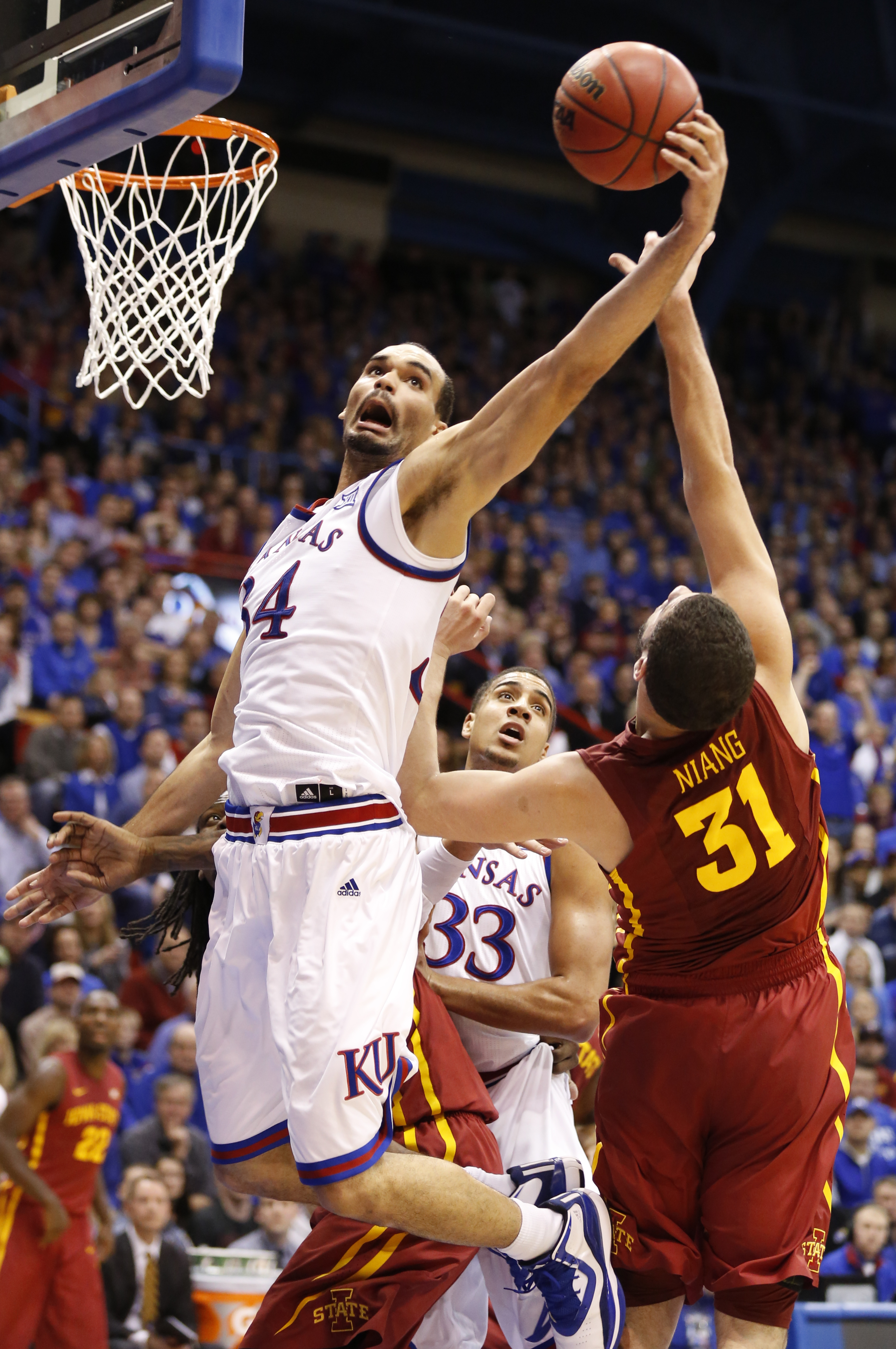 Kansas forward Perry Ellis (34) competes for a rebound with Iowa State forward Georges Niang (31) during the first half on Monday, Feb. 2, 2015 at Allen Fieldhouse.