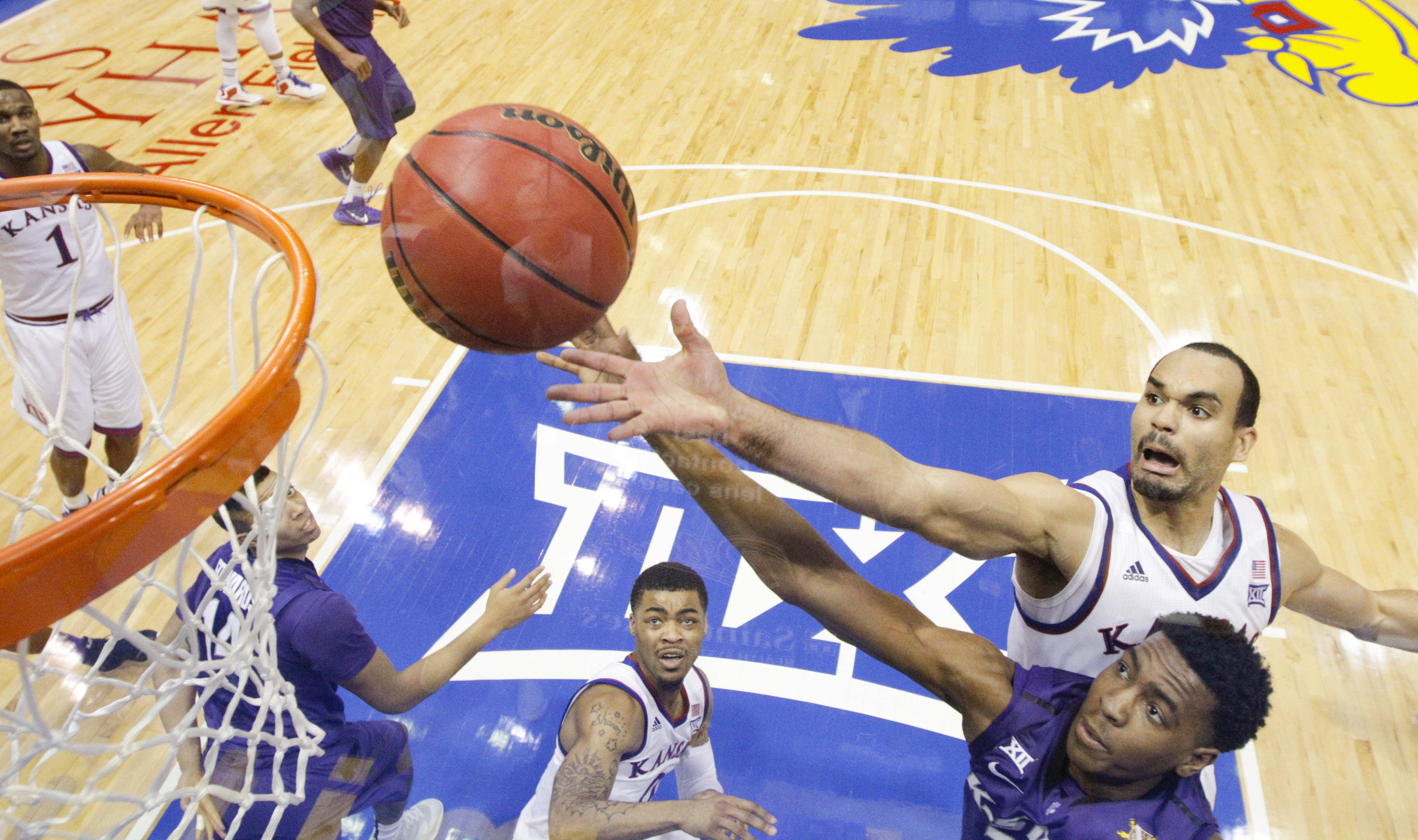 Kansas forward Perry Ellis fights for a rebound with Kansas State forward Nino Williams (11) during the second half on Saturday, Jan. 31, 2015 at Allen Fieldhouse.