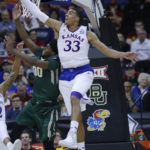 Kansas forward Landen Lucas (33) collects a rebound in the Jayhawk’s 62-52 win over Baylor in the semi-final of the Big 12 Tournament Friday at the Sprint Center in Kansas City, MO.