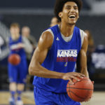 Kansas forward Kevin Young smiles as he and his teammates shoot around during a day of practices and press conference for teams in the South Regional at Cowboys Stadium in Arlington, Texas on Thursday, March 28, 2013.