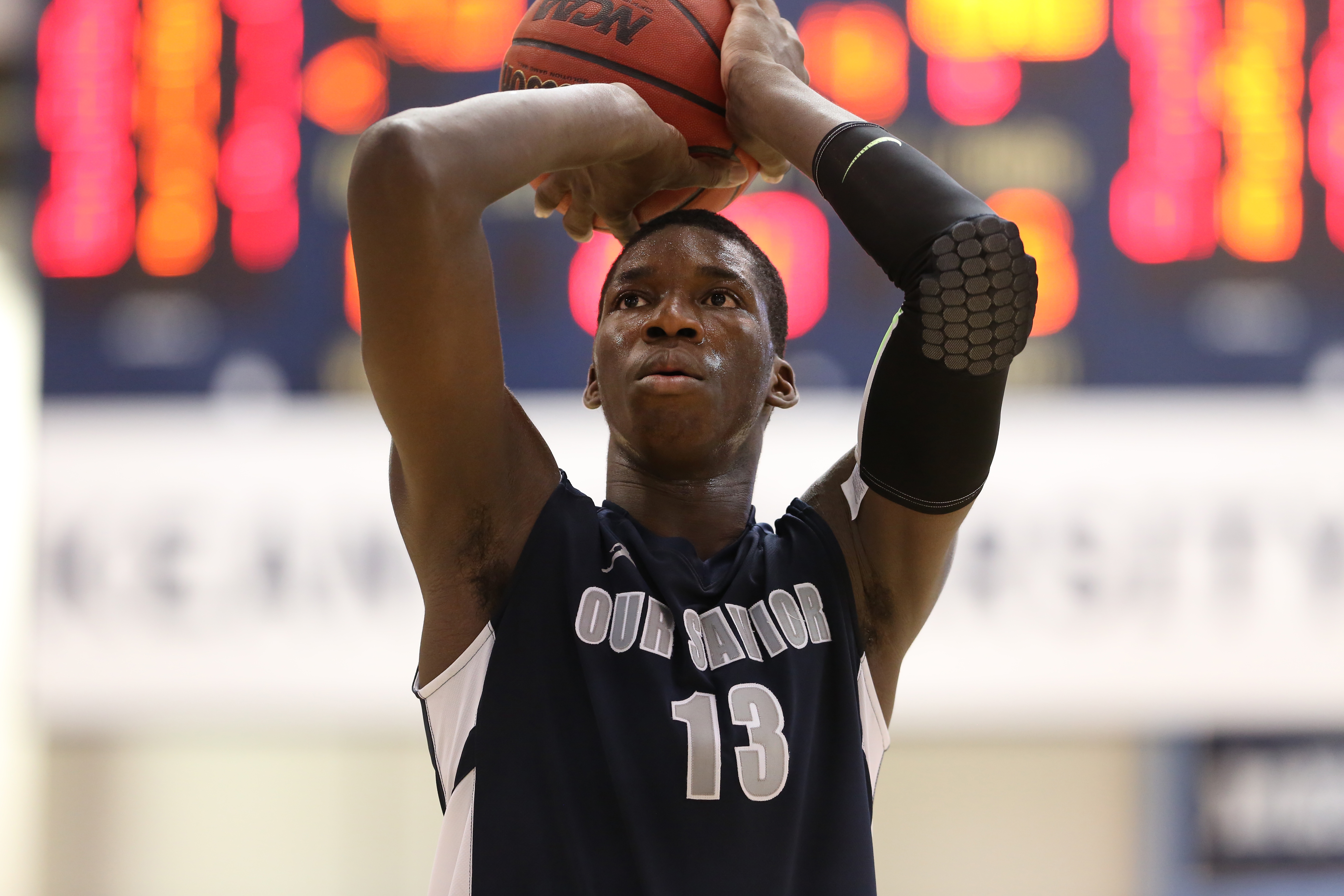 Our Savior New American’s Cheick Diallo (13) shoots a free throw against Linden during a high school basketball game in February in Kean, New Jersey. Diallo committed to Kansas University last week.