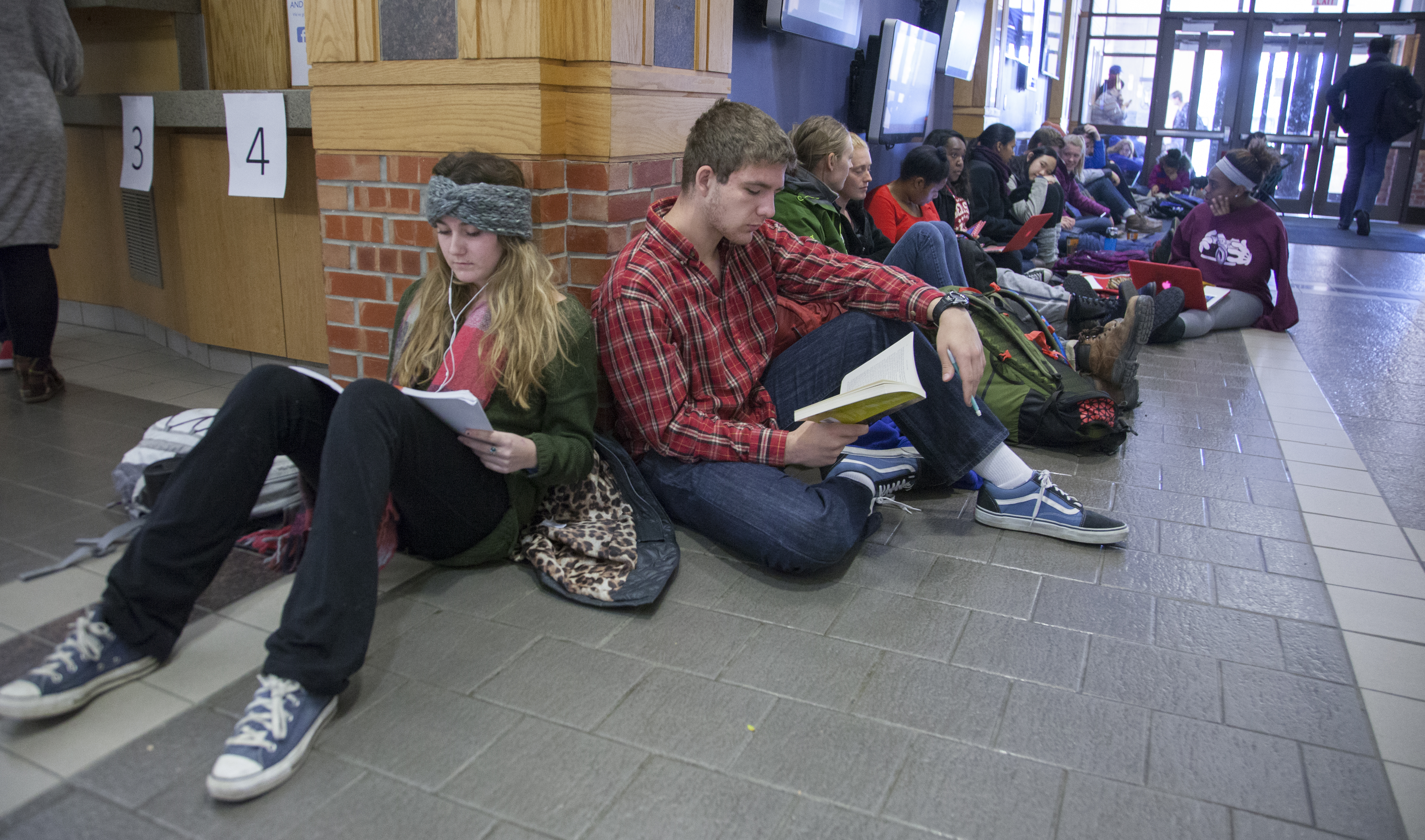 Sarah Herman, a Kansas University junior from Overland Park, left, sits just inside the entrance to the Kansas Union Monday, Nov. 9, 2015, waiting in line for tickets to see former President Bill Clinton Nov. 23 at the Lied Center. Herman was the last student to get to wait inside as others behind her were left to wait in the cool morning weather.