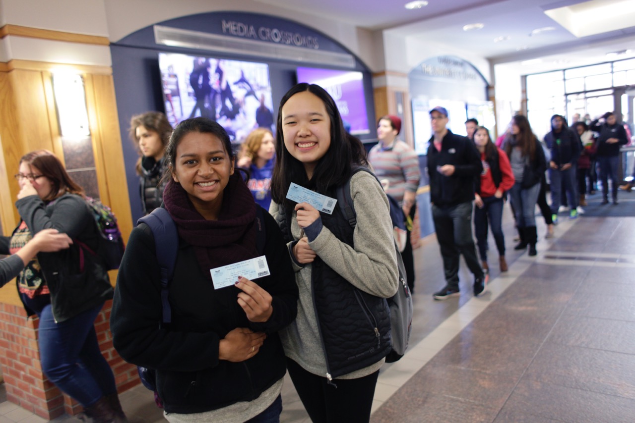 Kansas University students Nidhi Patel, left, and Helen Peng, both freshmen from Overland Park, display their tickets to see Bill Clinton speak Nov. 23 at the Lied Center. Patel and Peng said when they arrived at the Kansas Union about 4:30 a.m. they were the first ones there. They were allowed inside about 6 a.m., when the Union opened its doors, and got their tickets just after 9 a.m.