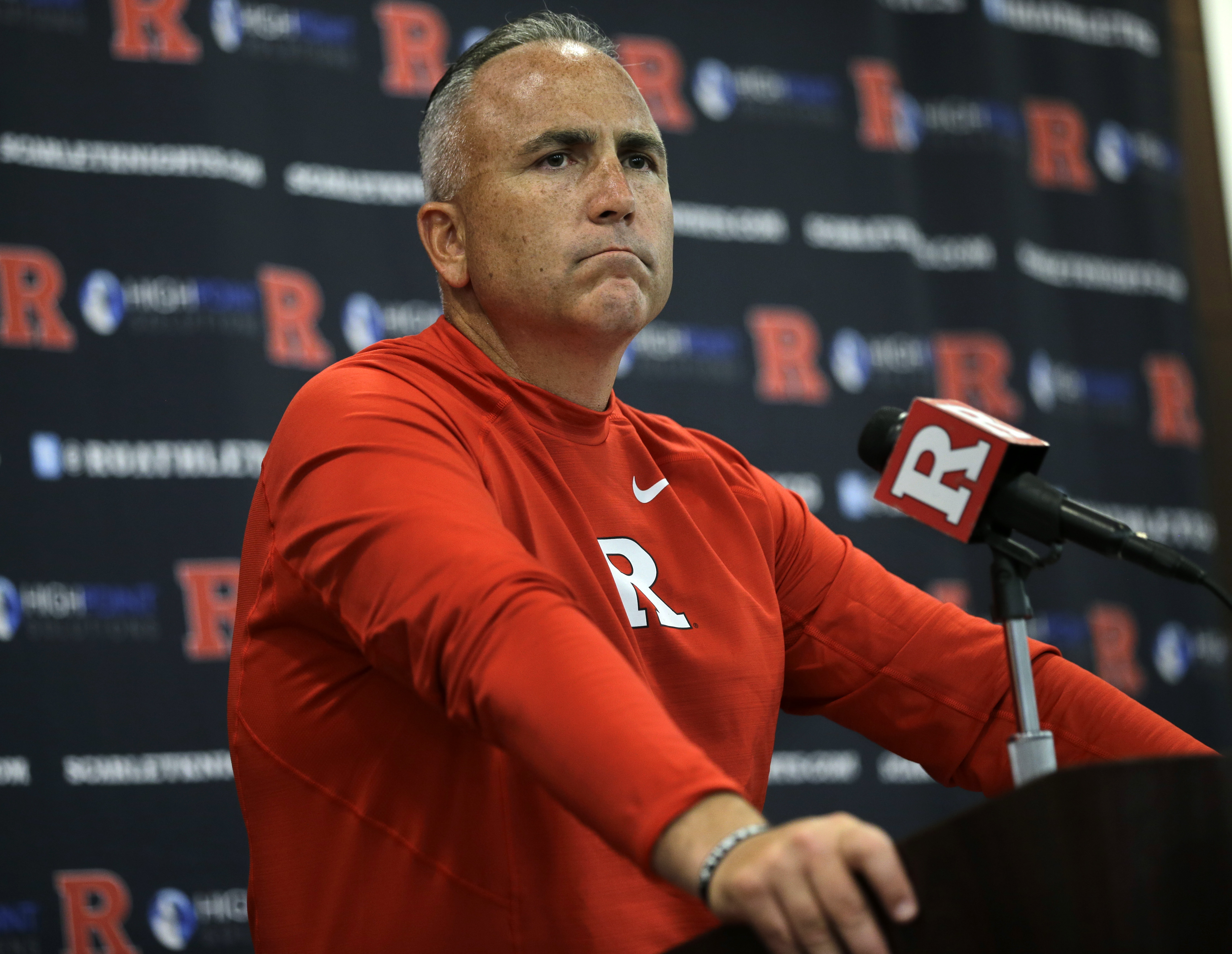 FILE - In this Saturday, Sept. 5, 2015 file photo, Rutgers head coach Kyle Flood listens to a question as he addresses the media after his team defeated Norfolk State, 63-13 in an NCAA college football game in Piscataway, N.J. Rutgers has suspended football coach Kyle Flood for three games after he contacted a faculty member over a player’s status. Rutgers President Robert Barchi announced the punishment Wednesday afternoon, Sept. 16, 2015, a day after he said he received an internal investigative report. (AP Photo/Mel Evans, File)