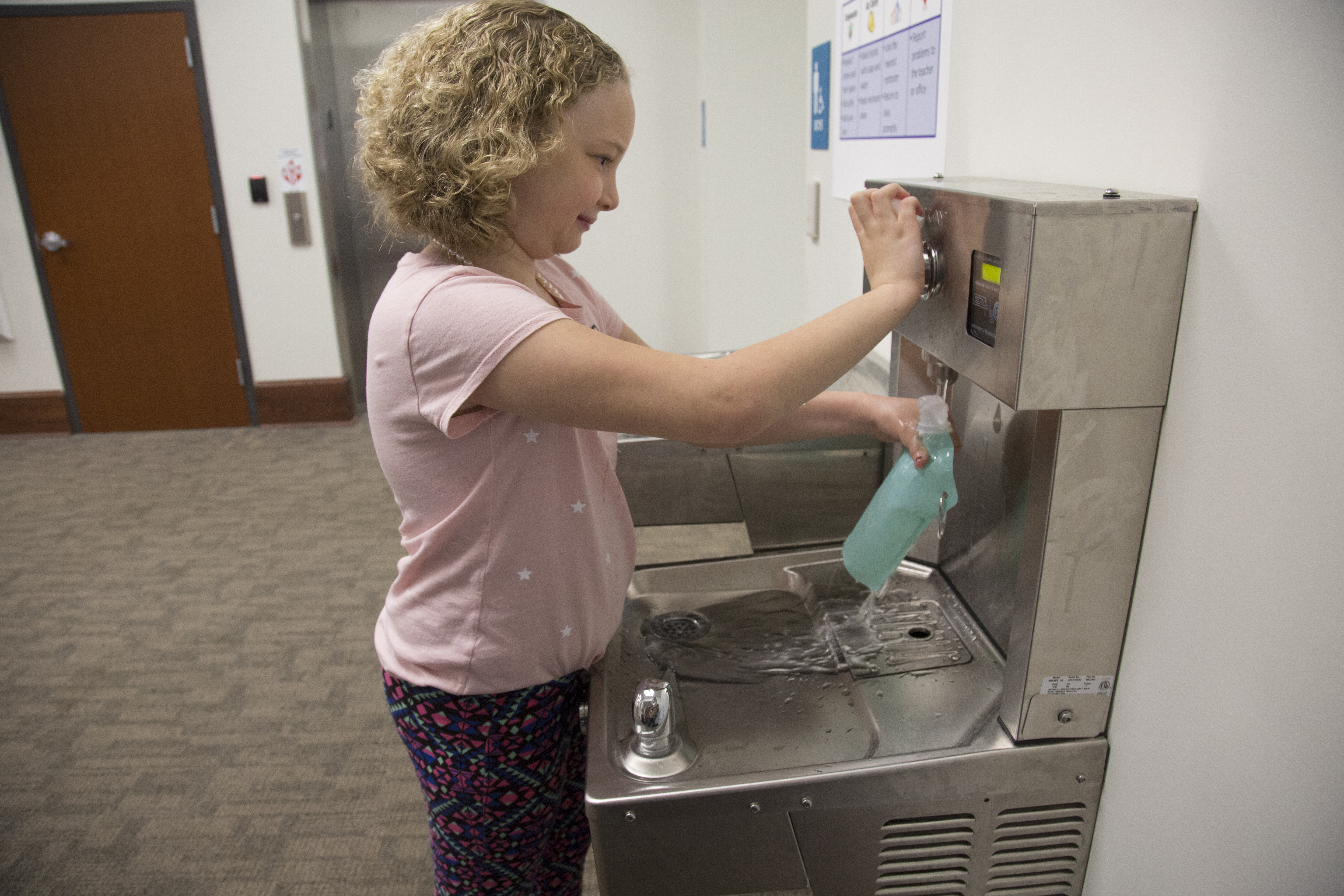 Third-grader Joy Hahn, 8, fills her water bottle from a new water fountain at Cordley Elementary School.
