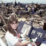 Beverly Long of Andover, Kansas displays a family album found in the debris of her mobile home in Andover, April 28, 1991. In the background, people sift through the wreckage for their belongings. (AP Photo/David Longstreath)