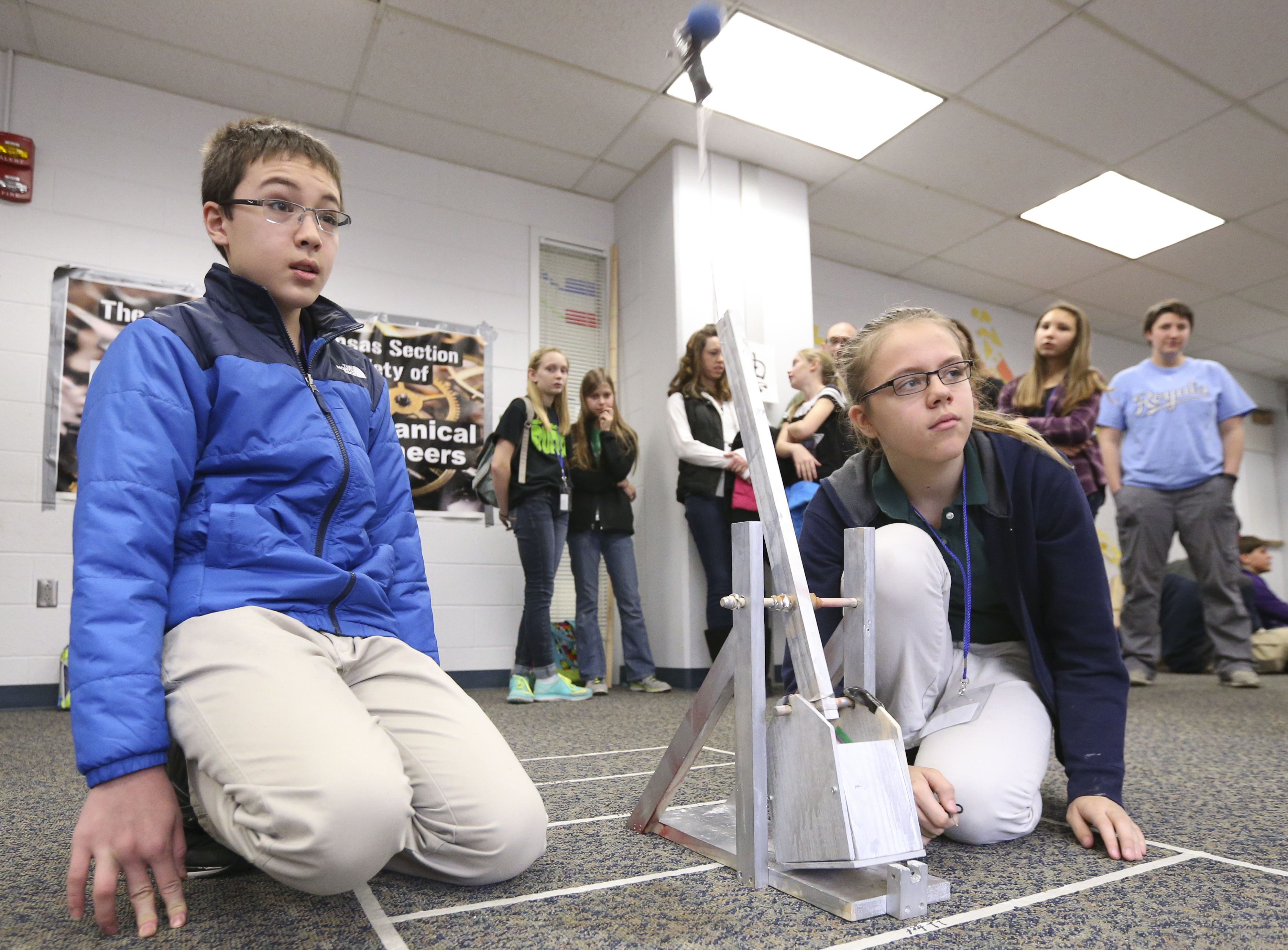 Bishop Seabury Academy sixth-graders Josh Williams, left, and Elizabeth Mangan watch as a trebuchet they designed launches a raquetball at a target during a demonstration at the Engineering Expo on Thursday, Feb. 25, 2016 at the School of Engineering on the Kansas University campus. Area middle schoolers spent the day experimenting, showing off their engineering projects and putting them to various scientific tests. The event continues through Saturday.