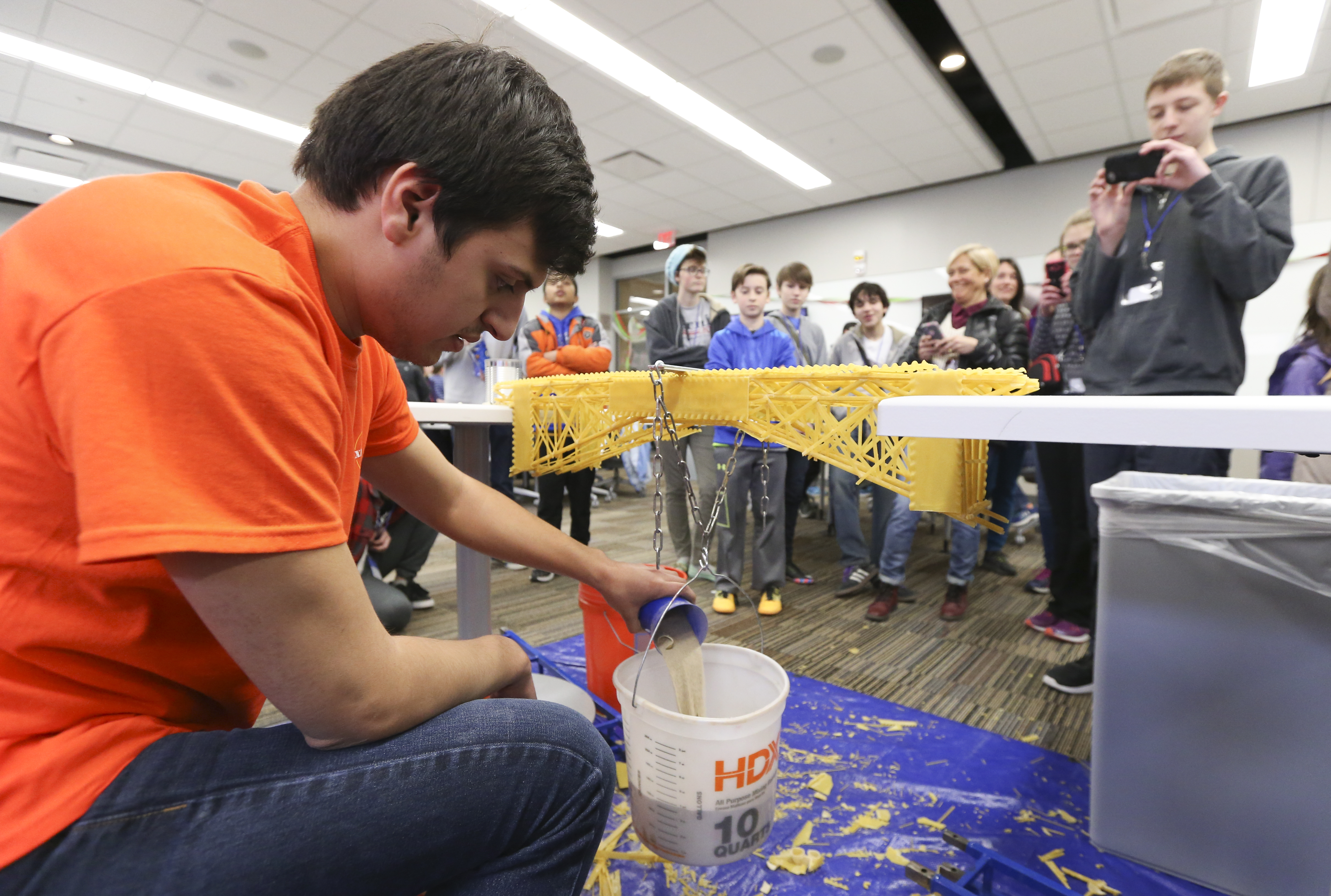 Kansas University freshman Bryant Carranza, of Olathe, pours sand into a bucket suspended from a pasta bridge designed by South Middle School eighth-grader Charlie Nigro, Lawrence, right, during the Engineering Expo on Thursday, Feb. 25, 2016 at the School of Engineering on the Kansas University campus. One entry in the pasta bridge competition held a weight of 56.2 pounds of sand before collapsing. Area middle schoolers spent the day experimenting, showing off their engineering projects and putting them to various scientific tests. The event continues through Saturday.