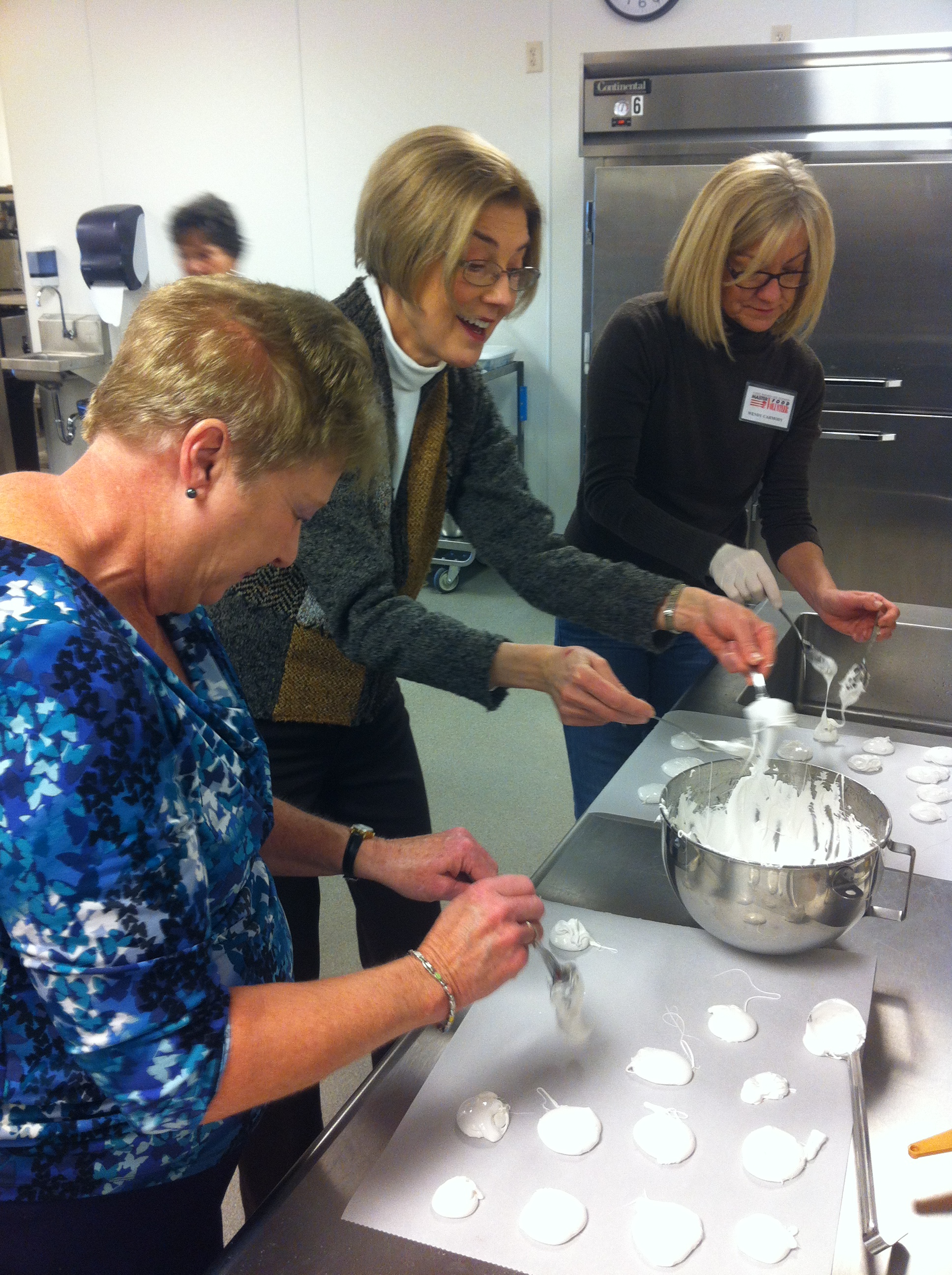 Left to right, Barbara Wilson, Mary Locniskar and Wendy Carmody, all of Douglas County, receive hands-on experience on making an egg white foam and meringue during the 2013 Extension Master Food Volunteer Training held at K-State Olathe.