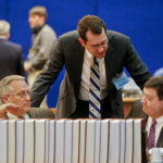 Kansas Attorney General Derek Schmidt, center, speaks with state attorneys Steve McAllister, right, and Arthur Chalmers during a recess between oral arguments to the Supreme Court on Tuesday May 10, 2016, in Topeka, Kan. in front of the Kansas Supreme Court, Tuesday May 10, 2016, in Topeka, Kan. The court was hearing arguments Tuesday on whether the technical changes approved by lawmakers earlier this year are fair enough to poor districts that the justices can abandon a threat to shut down public schools. (Chris Neal/The Topeka Capital-Journal via AP)