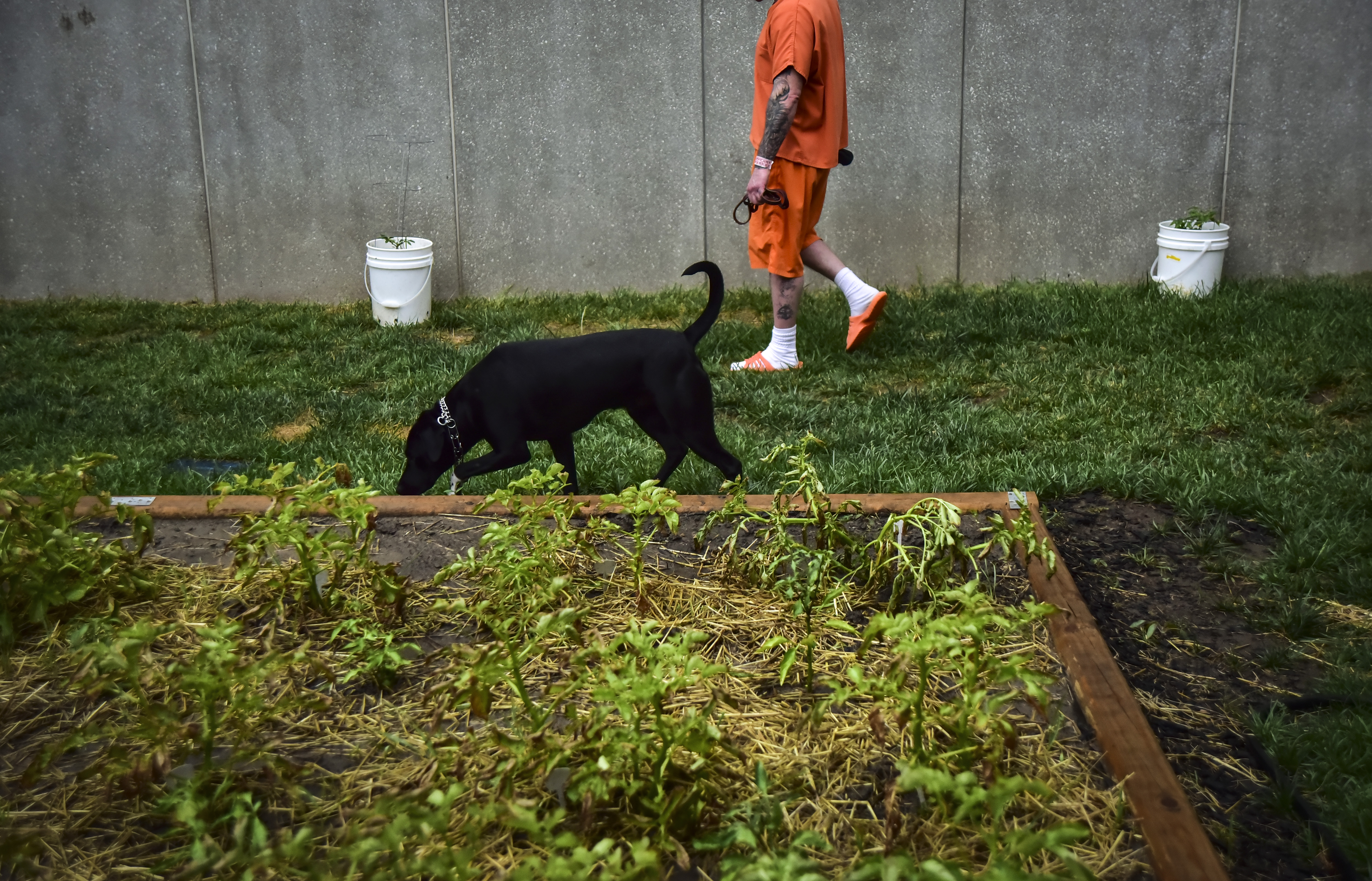 In this photo taken Wednesday, June 15, 2016, an inmate handler walks with Chip, an 18-month-old black Labrador retriever and Dalmatian mix, in the outdoor garden to go to the bathroom at the Reno County Correctional Facility in Hutchinson, Kan. Chip is part of the Lucky Dog program, which began May 25 where dogs receive training from inmates day and night.
