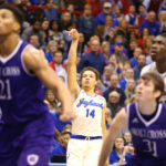 Kansas guard Brannen Greene (14) watches one of his first-half three pointers, Wednesday, Dec. 9, 2015 at Allen Fieldhouse.