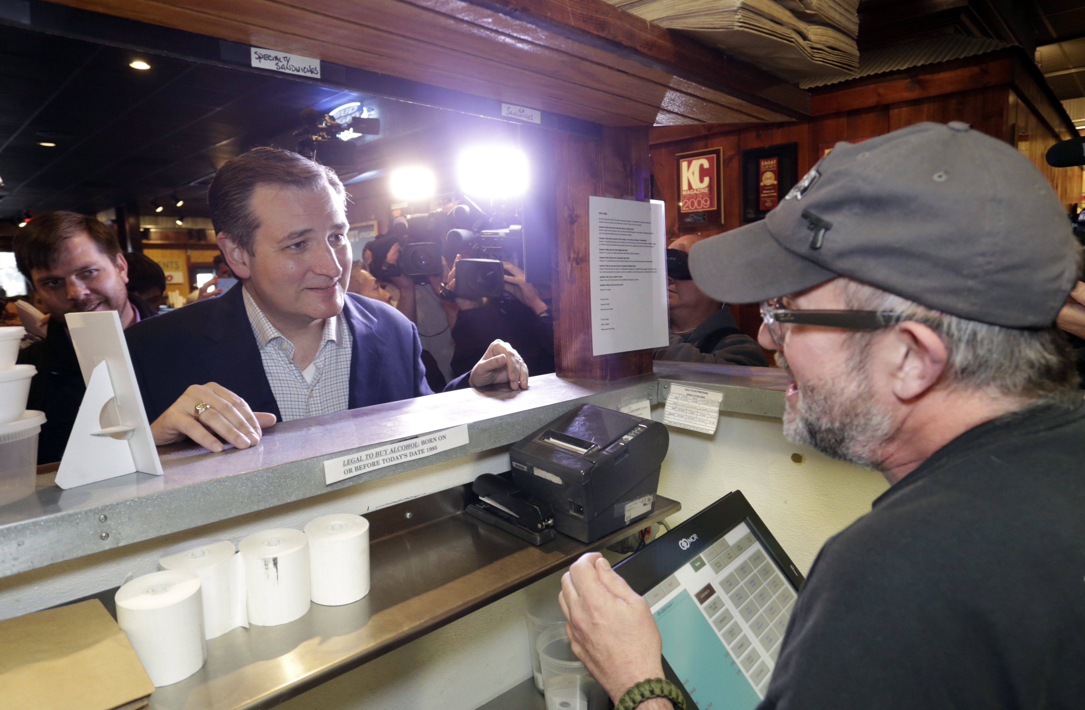 Republican presidential candidate, Sen. Ted Cruz, R-Texas, orders a Z-Man sandwich at Joe's Kansas City Bar-B-Que in Olathe, Kan., Wednesday, March. 2, 2016. (AP Photo/Colin E. Braley)