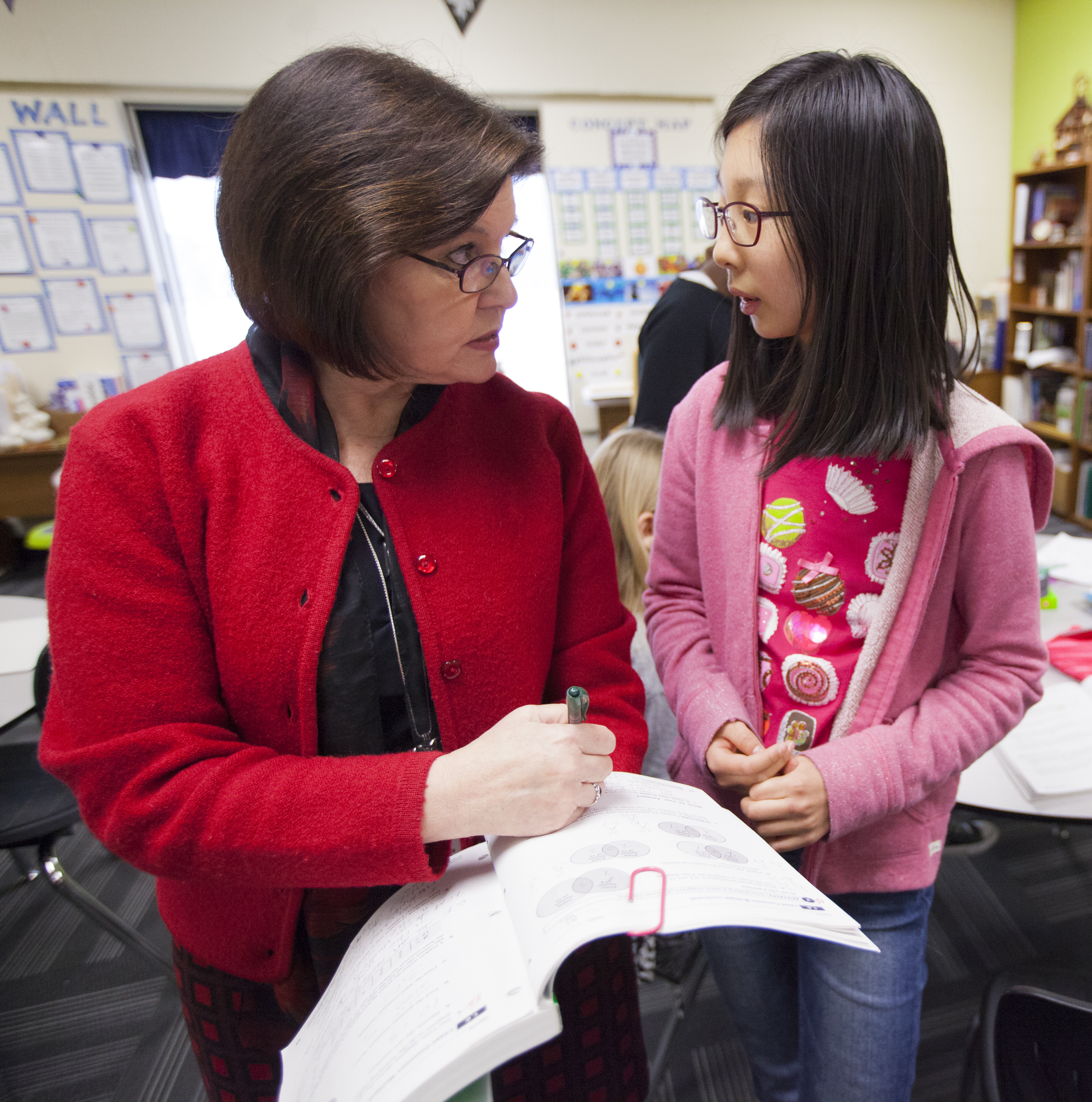 Quail Run fifth-grade teacher Christine Valcich talks with Emma Liu as the two review her work on Tuesday, March 1, 2016 at the school.