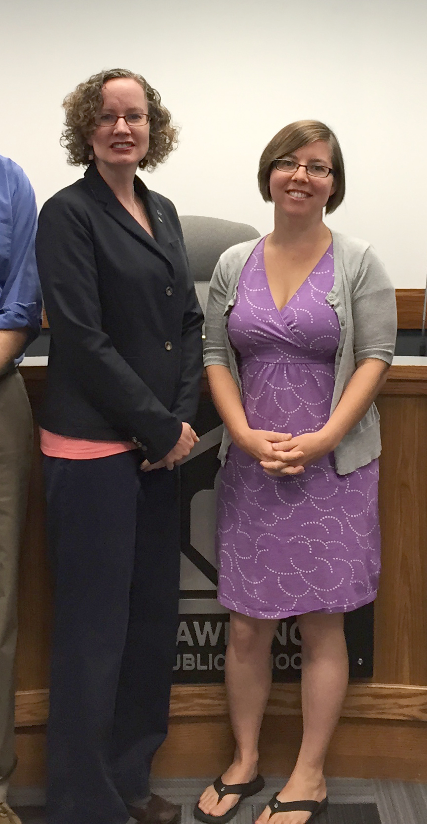 From left, Lawrence school board member Kristie Adair and school board president Vanessa Sanburn pose with other members of the board after new members were sworn in on Wednesday, July 1, 2015.