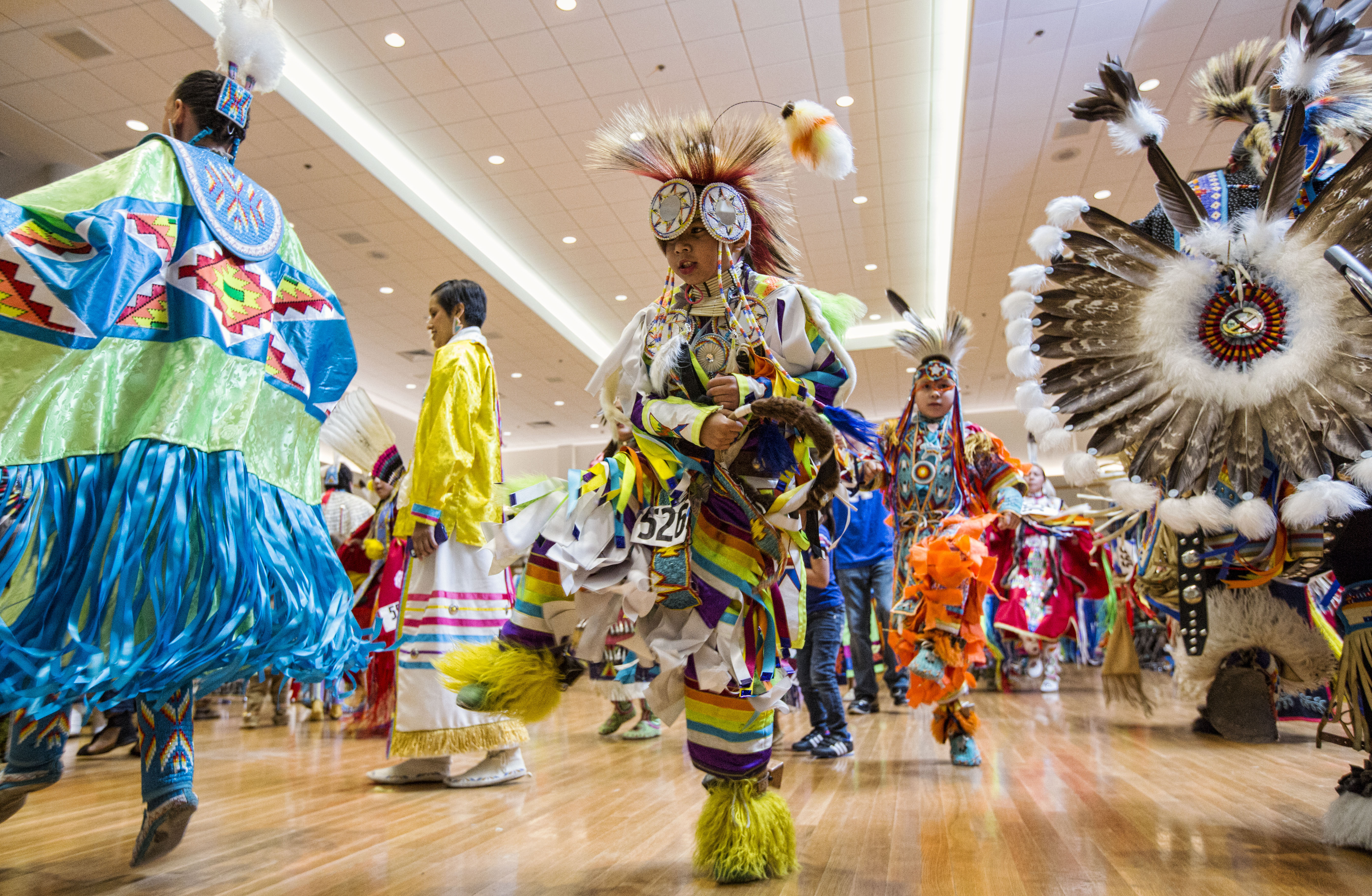 Eight-year-old Ross Ike, of Omaha, Neb., spins as he dances during an inter-tribal dance at the annual KU Spring Powwow Saturday, April 11, 2015, in the ballroom of the Kansas Union.