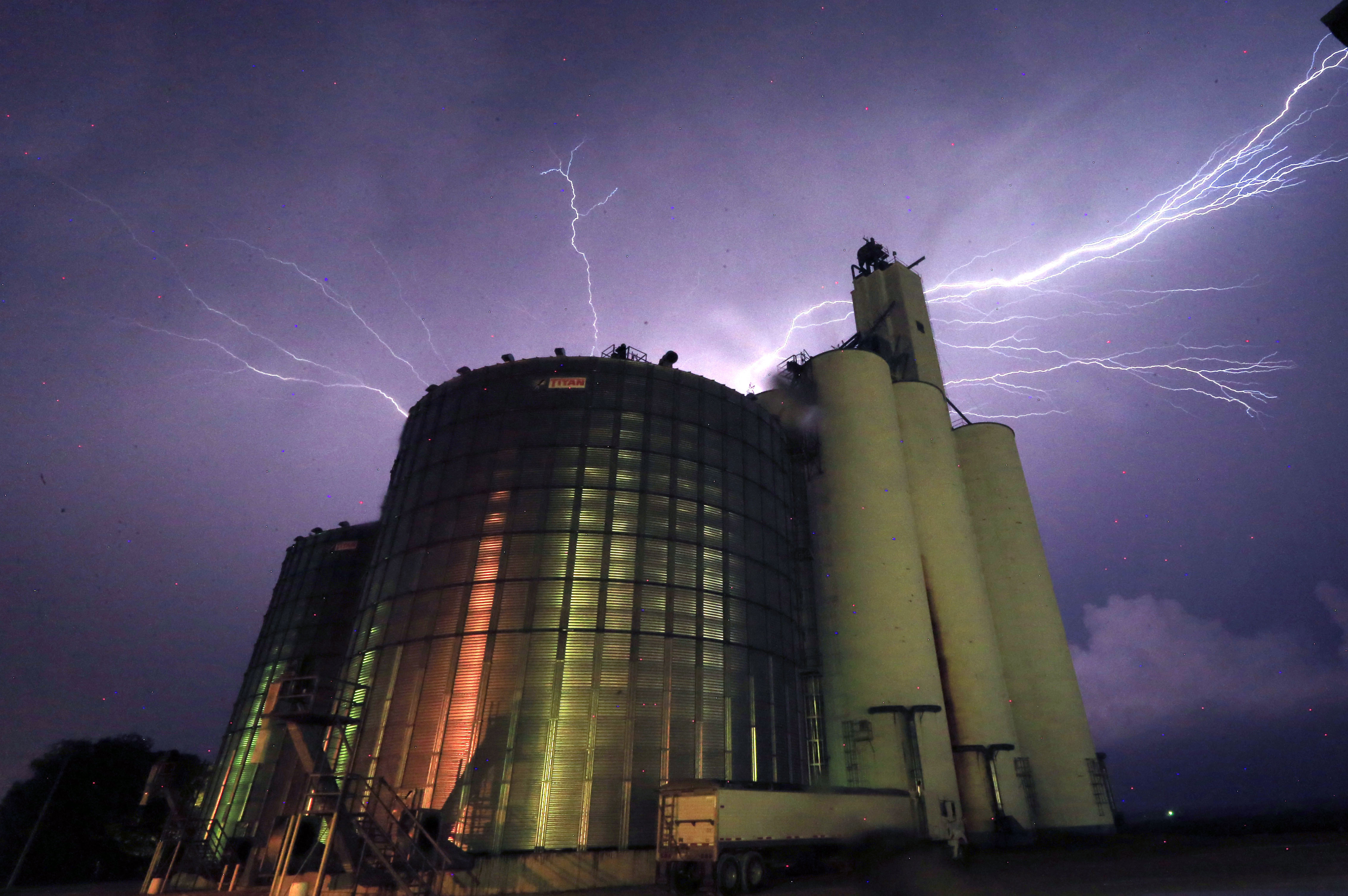 Lightning from a severe storm fills the sky behind a grain elevator in Belvue, Kan., Wednesday, May 25, 2016. The storm produced tornadoes near Chapman, Kan. (AP Photo/Orlin Wagner)