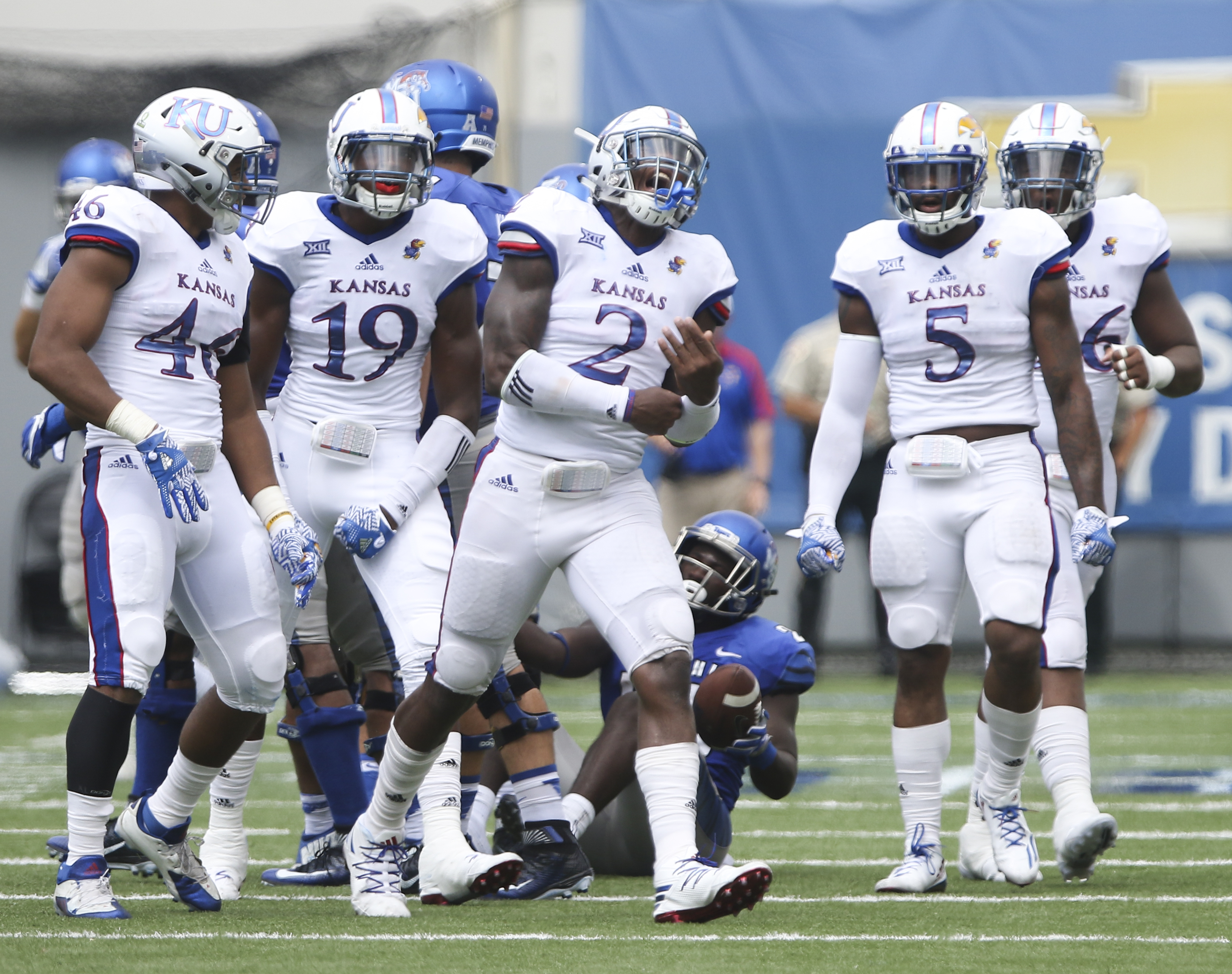 Kansas defensive end Dorance Armstrong Jr. (2) celebrates after a tackle for a loss during the second quarter on Saturday, Sept. 17, 2016 at Liberty Bowl Memorial Stadium in Memphis, Tenn.