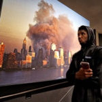 Kansas sophomore Carlton Bragg Jr., examines a photograph depicting the World Trade Center towers burning and smoking following the terrorist attack on the area on Sept. 11, 2001.