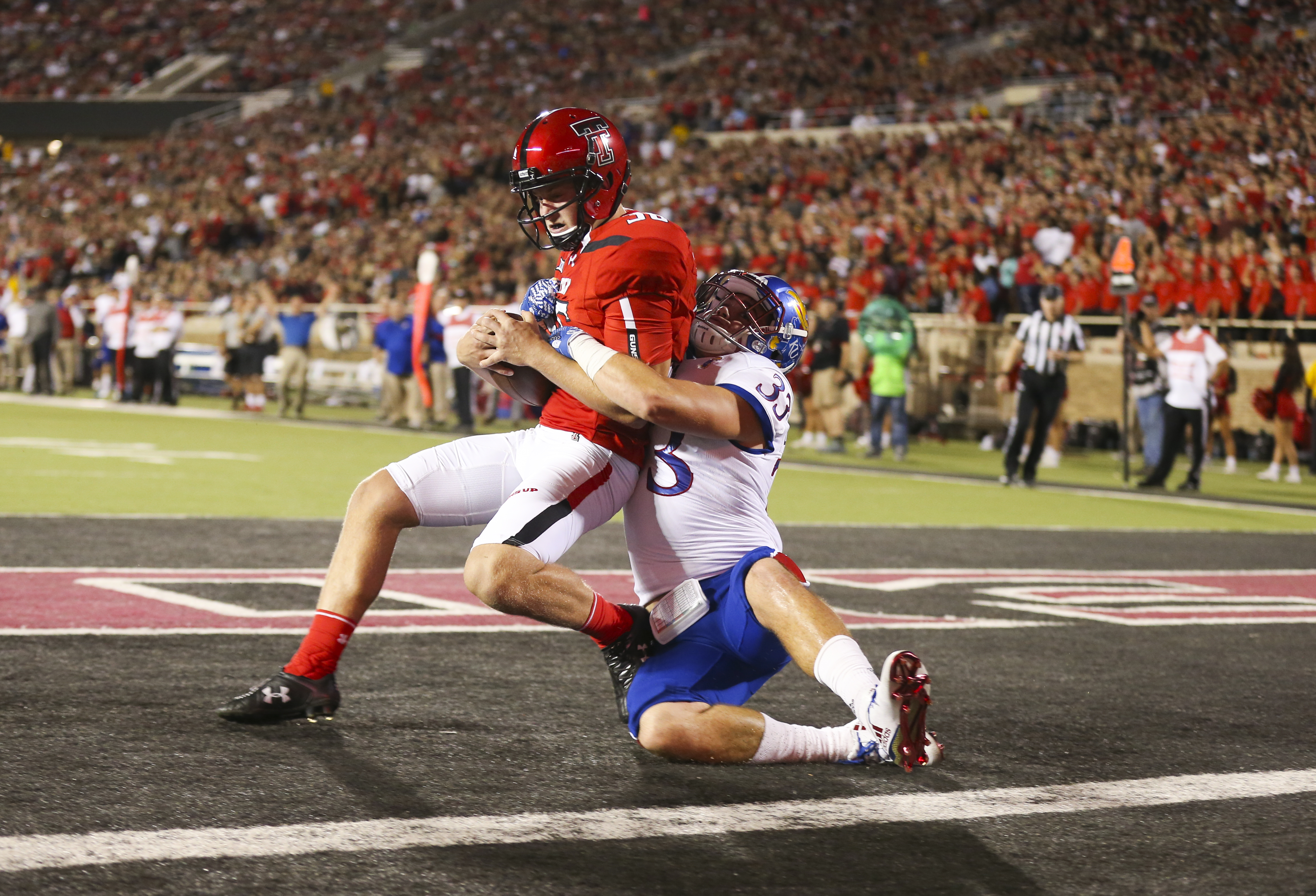 Kansas special teams player Keith Loneker (33) pulls down Texas Tech place kicker Erik Baughman (36) for a safety during the second quarter on Thursday, Sept. 29, 2016 at Jones AT&T Stadium in Lubbock, Texas.