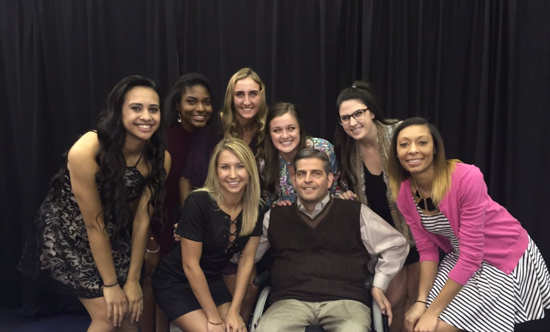 Members of the 2016 Kansas volleyball team pose with academic advisor Scott Scooter Ward. On Friday, Oct. 7, Ward suffered a tear of his aorta and was rushed into surgery, prompting several members of the KU volleyball and men's basketball teams to send out thoughts and prayers for one of the most popular and well-liked members of either program.