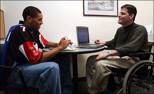 Kansas University junior men's basketball player Wayne Simien, left, laughs with academic counselor Scott Ward in 2004 while going over Simien's homework schedule at Wagnon Student Athletic Center. Ward, who works with the men's basketball, volleyball and tennis squads at KU, has overcome a paralyzing accident to realize his dream of coaching.