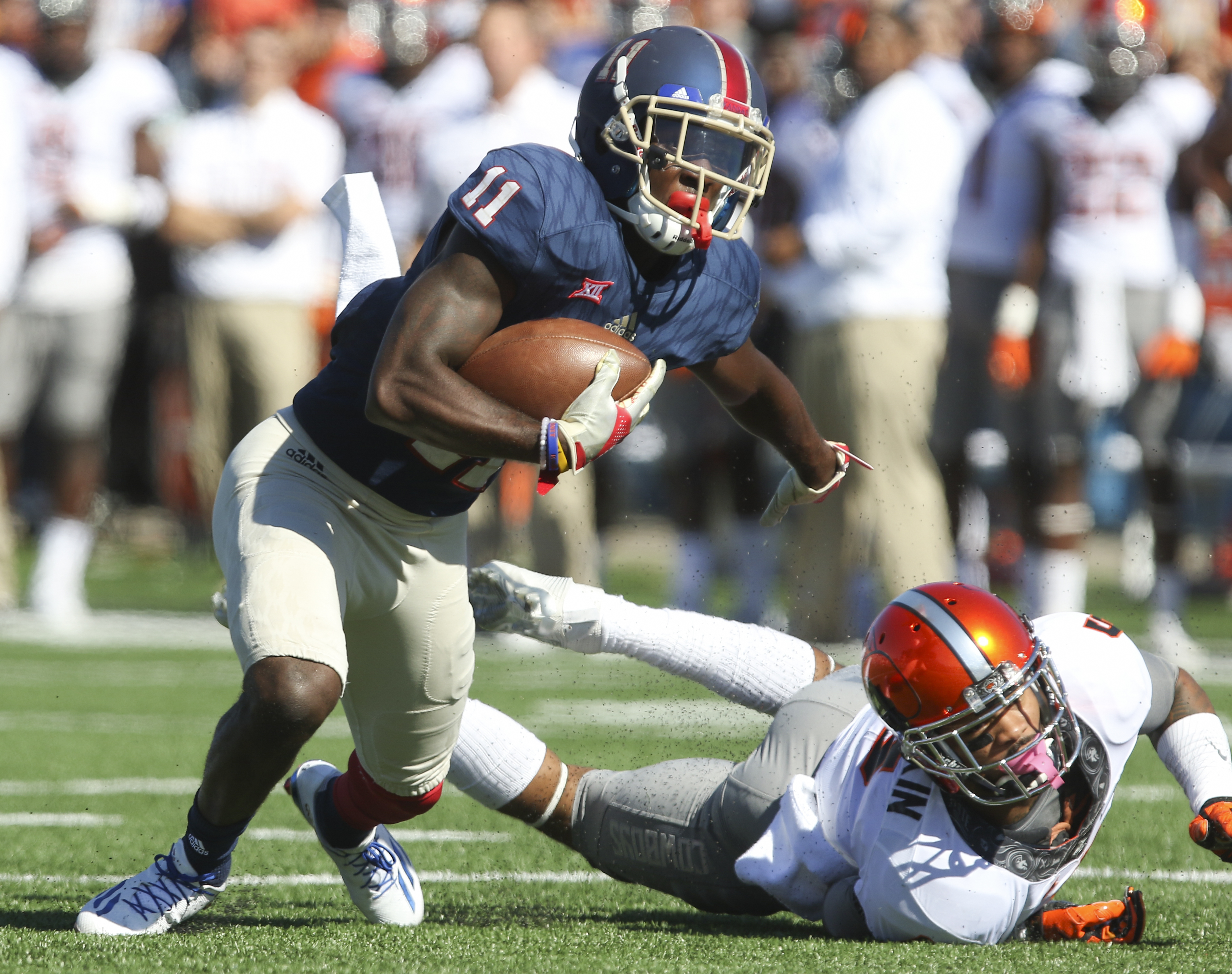 Kansas wide receiver Steven Sims Jr. (11) shrugs off Oklahoma State safety Jerel Morrow (5) during the third quarter on Saturday, Oct. 22, 2016 at Memorial Stadium.