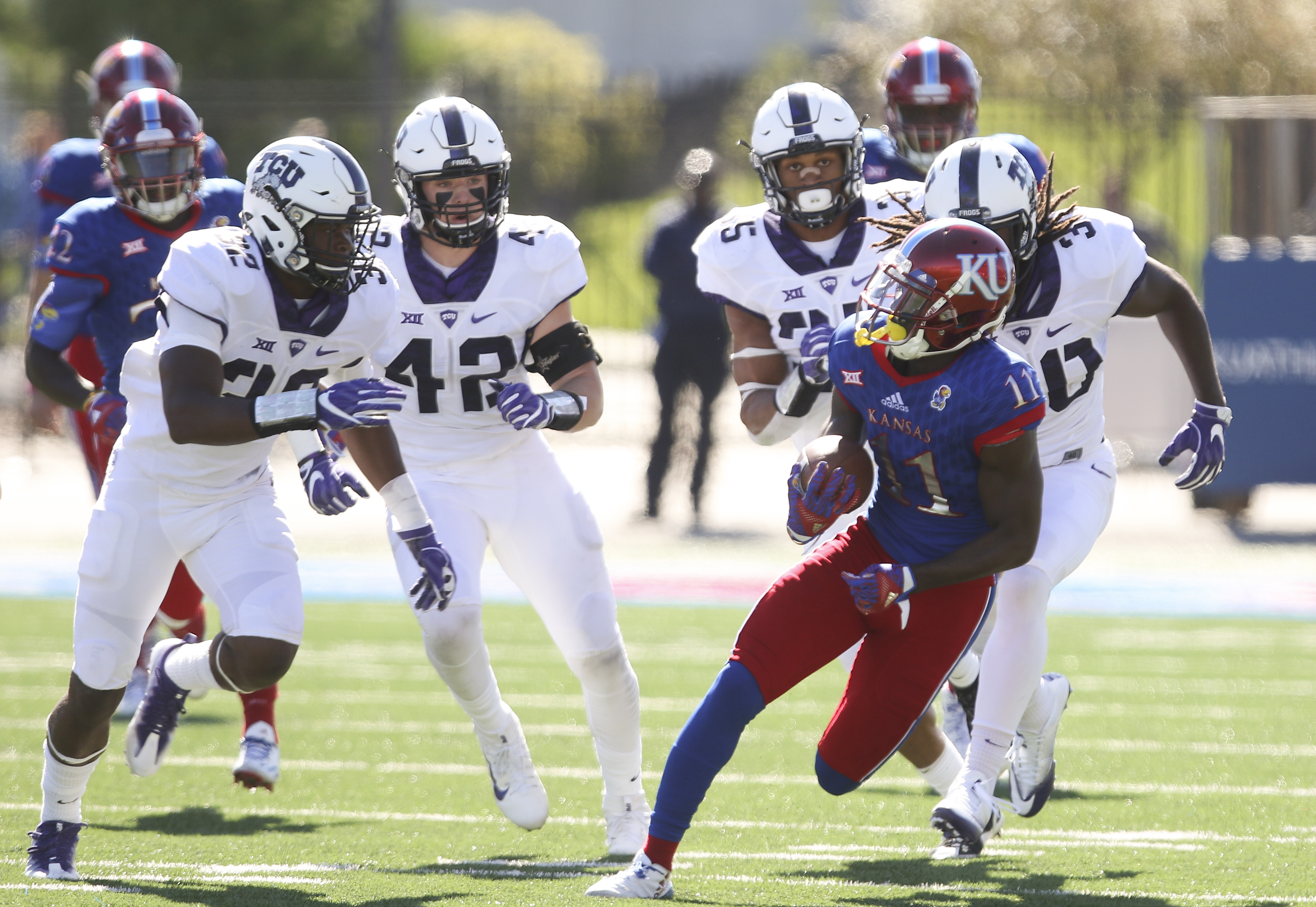 Kansas wide receiver Steven Sims Jr. (11) tears down the field as he is trailed by the TCU defense after a catch during the first quarter on Saturday, Oct. 8, 2016 at Memorial Stadium.