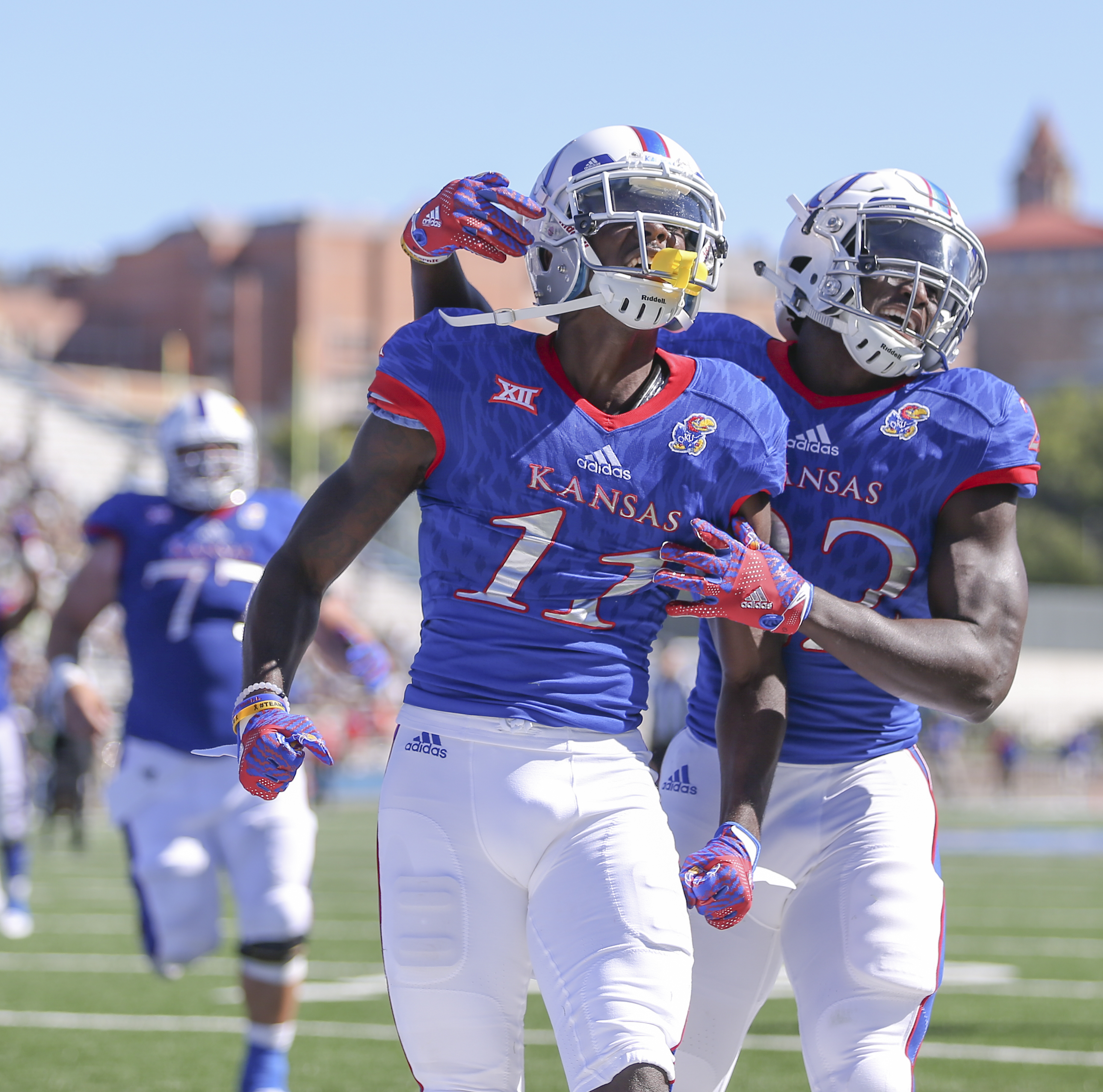 Kansas wide receiver Steven Sims Jr. (11) celebrates with teammate Ke'aun Kinner (22) after his second touchdown of the third quarter on Saturday, Sept. 10, 2016 at Memorial Stadium.