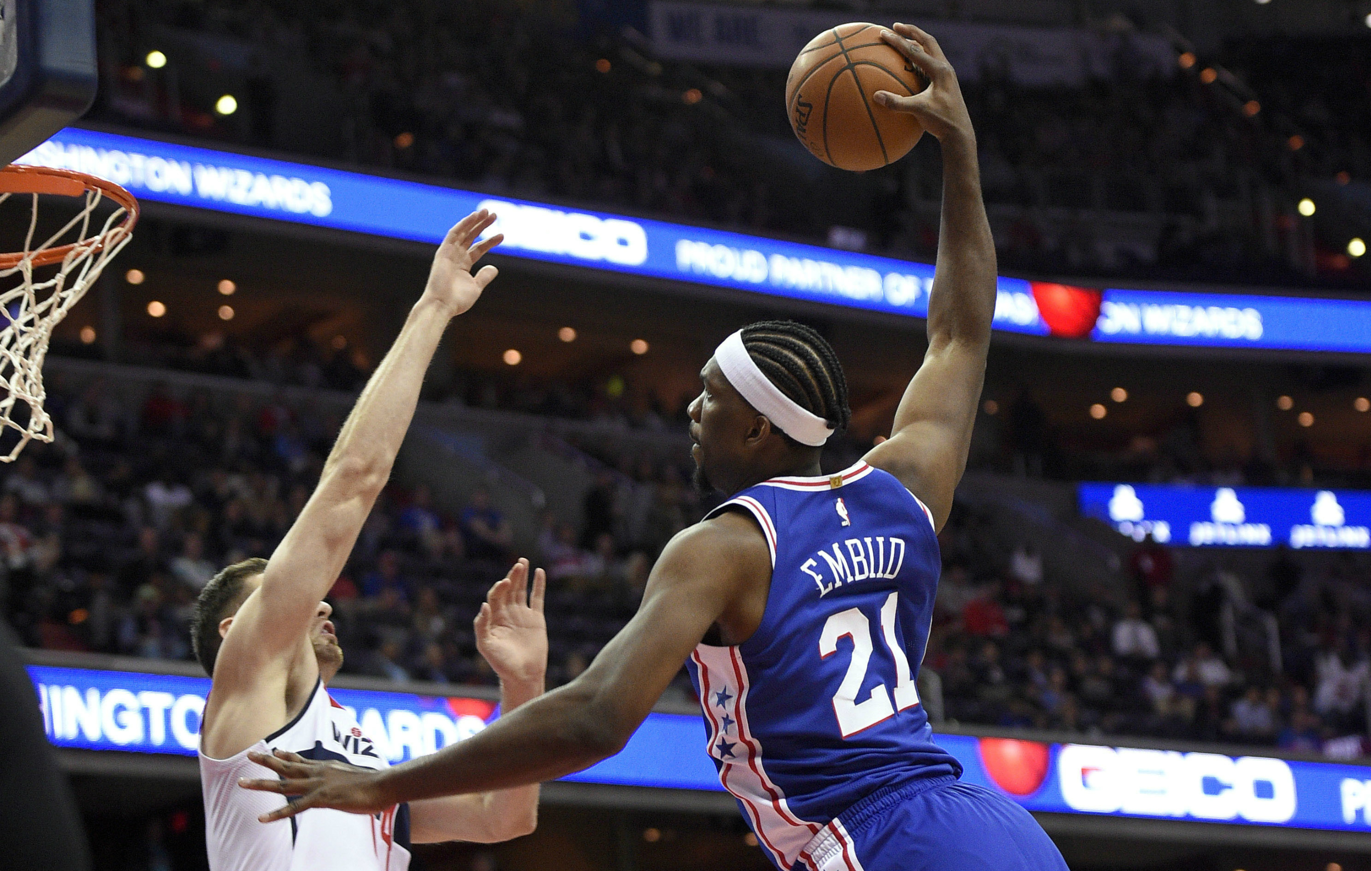 - Philadelphia 76ers center Joel Embiid (21) goes to the basket against Washington Wizards forward Jason Smith, left, during the first half of an NBA basketball game, Wednesday, Oct. 18, 2017, in Washington. Smith was charged with a foul on the play.(AP Photo/Nick Wass)