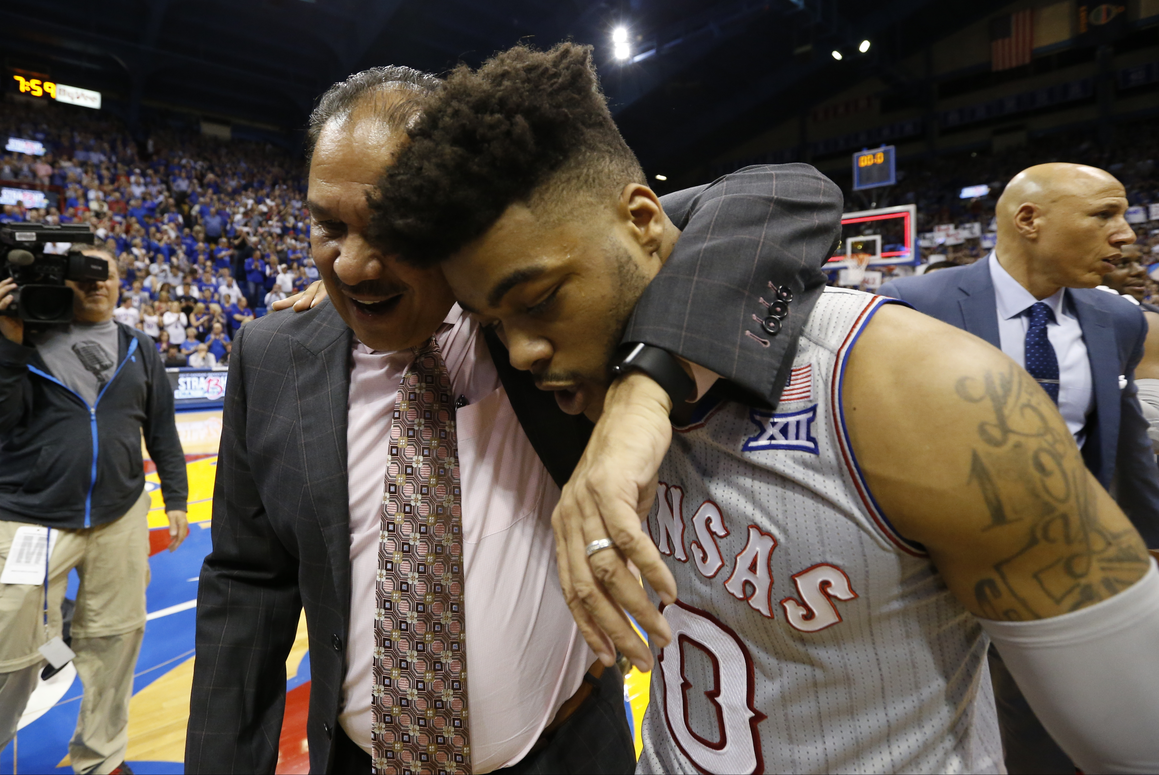 Kansas guard Frank Mason III (0) gets a hug from assistant coach Kurtis Townsend following the Jayhawks' win over TCU for their 13th-straight Big 12 conference title, Wednesday, Feb. 22, 2017 at Allen Fieldhouse.