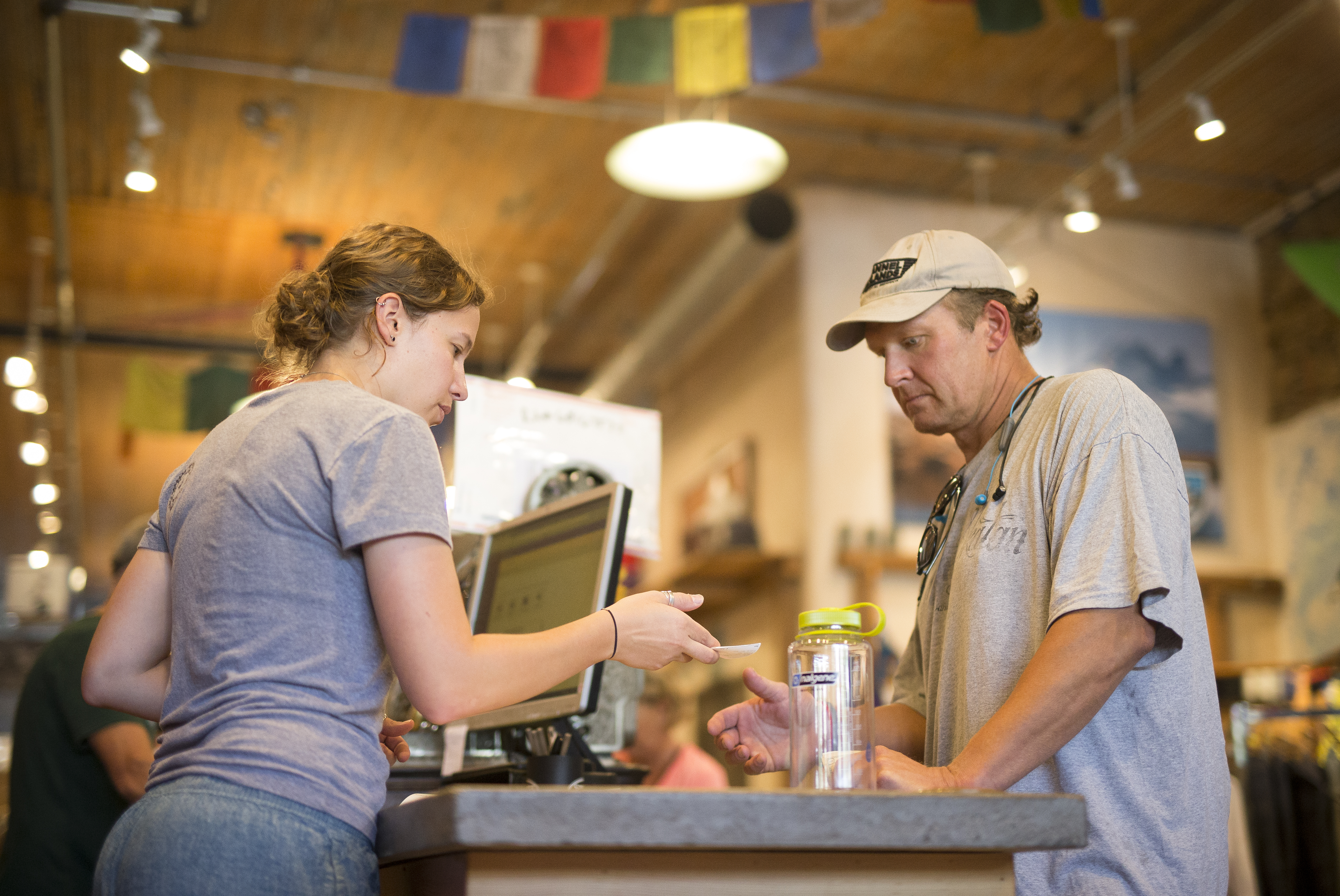 Sunflower Outdoor and Bike Shop manager Sara Bilhimer hands a receipt to Nate Penny, of Lawrence, after a purchase on Thursday, July 6, 2017, at the downtown Lawrence store. A city proposal seeks to renew a .55 percent sales tax that applies to all purchases citywide to fund infrastructure, transit and affordable housing. Opponents of the renewal believe it will disproportionately affect low-income residents.