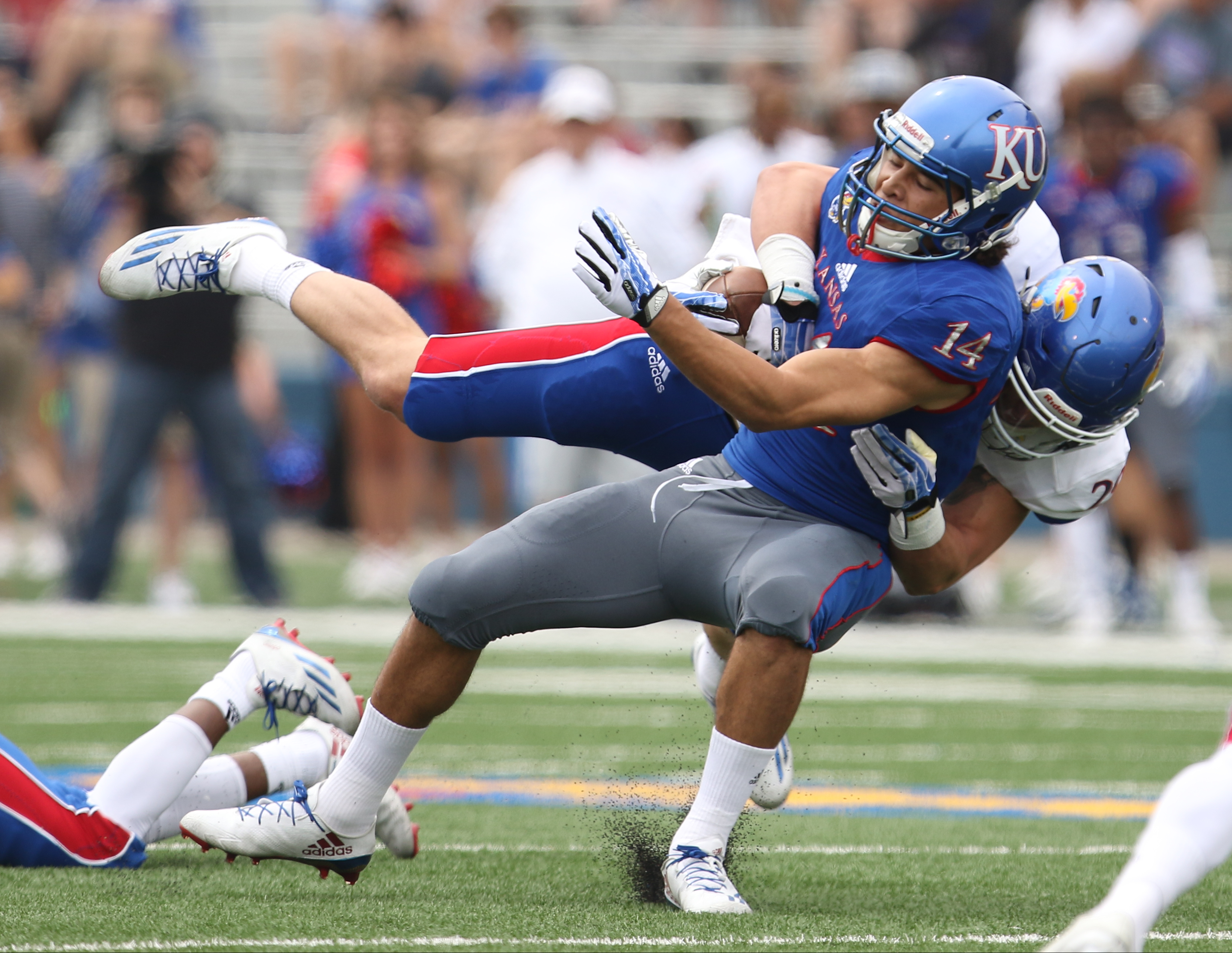 Team KU receiver Kerr Johnson Jr. (14) is taken to the turf by Team Jayhawk linebacker Joe Dineen Jr. (29) during the first quarter of the 2017 Spring Game on Saturday, April 15 at Memorial Stadium.