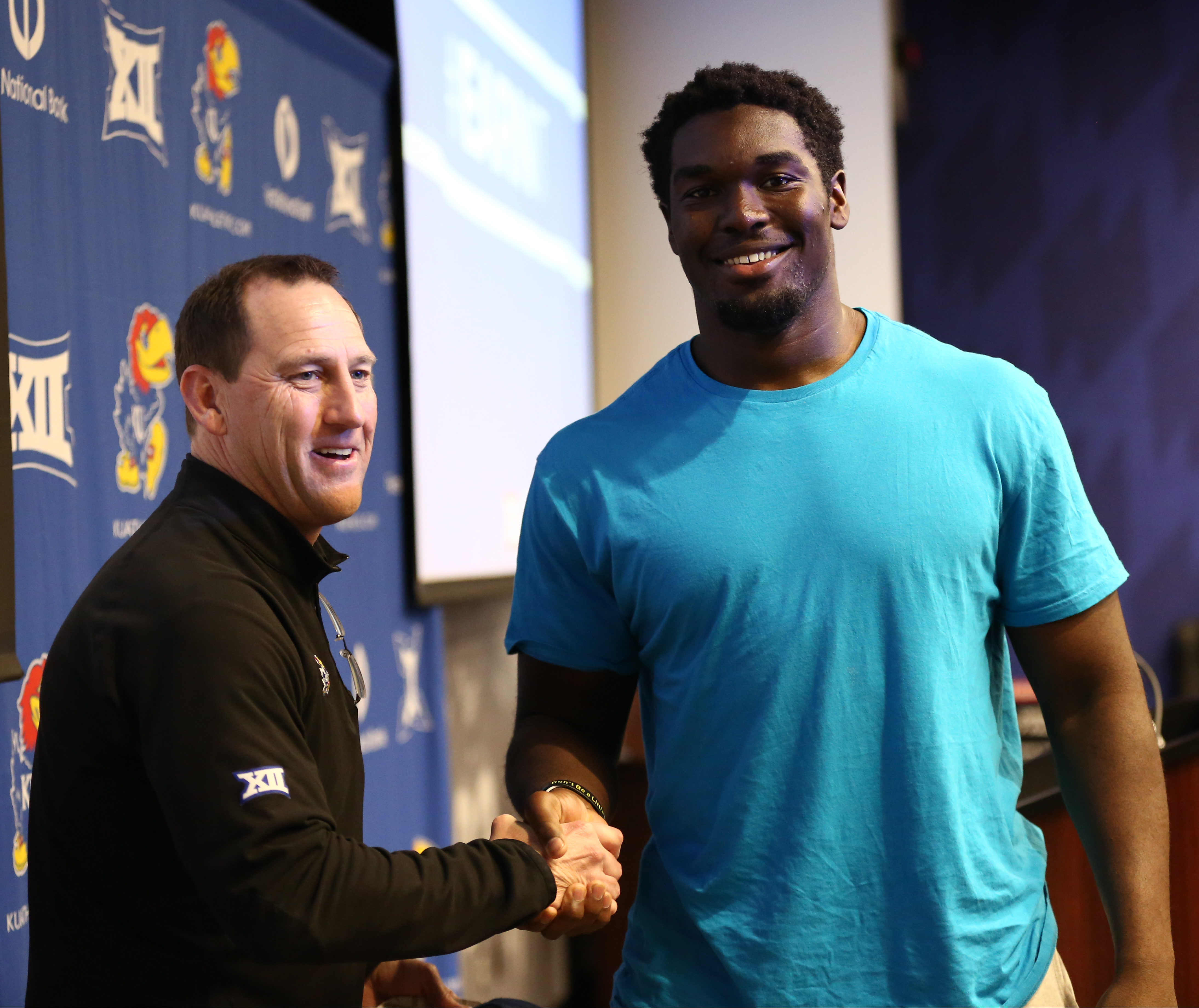 Kansas offensive tackle Hakeem Adeniji is congratulated by head coach David Beaty after being selected third overall during a spring game player draft on Wednesday, April 12, 2017 at the Anderson Family Football Complex.