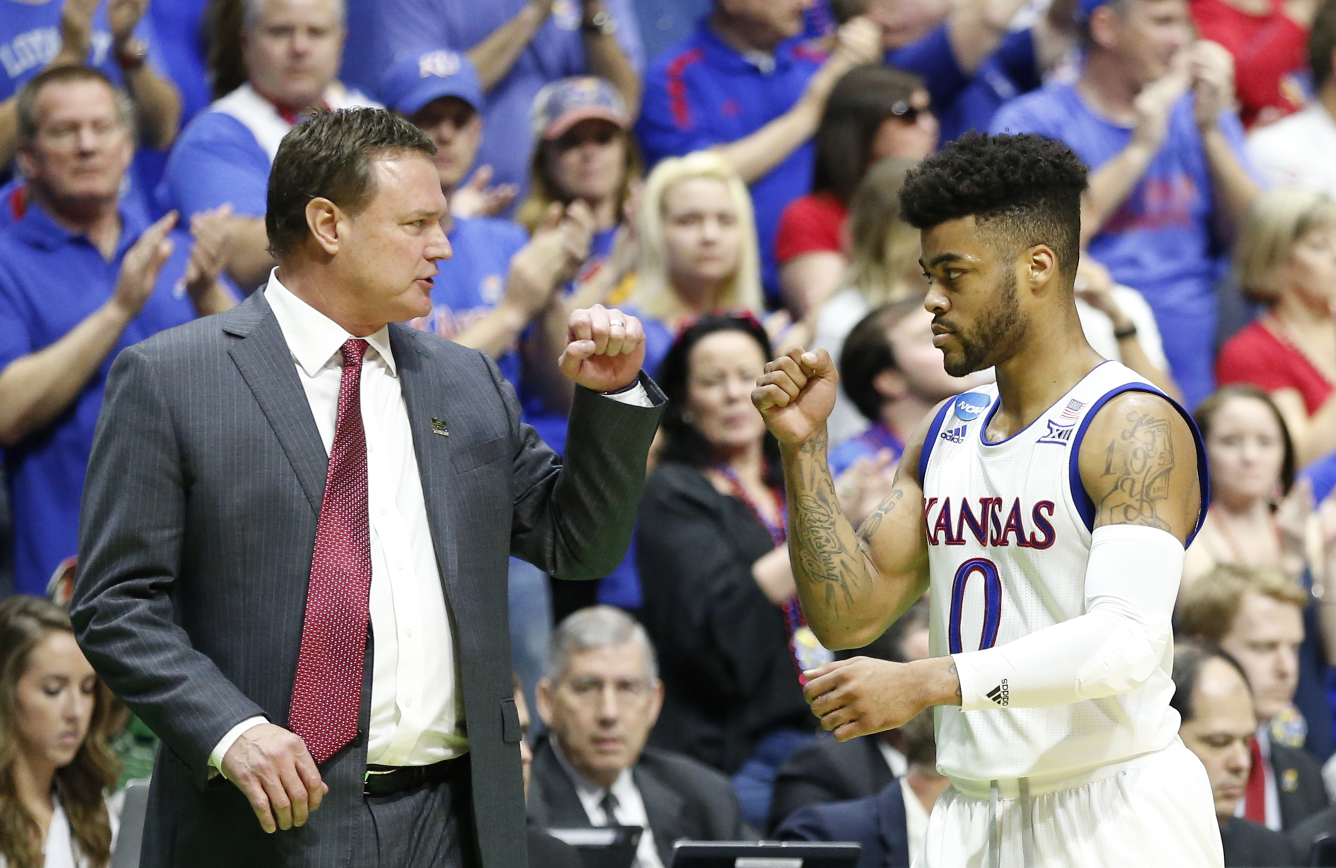 Kansas head coach Bill Self and Kansas guard Frank Mason III (0) pound fists as Mason leaves the game late in the second half on Sunday, March 19, 2017 at BOK Center in Tulsa, Okla.
