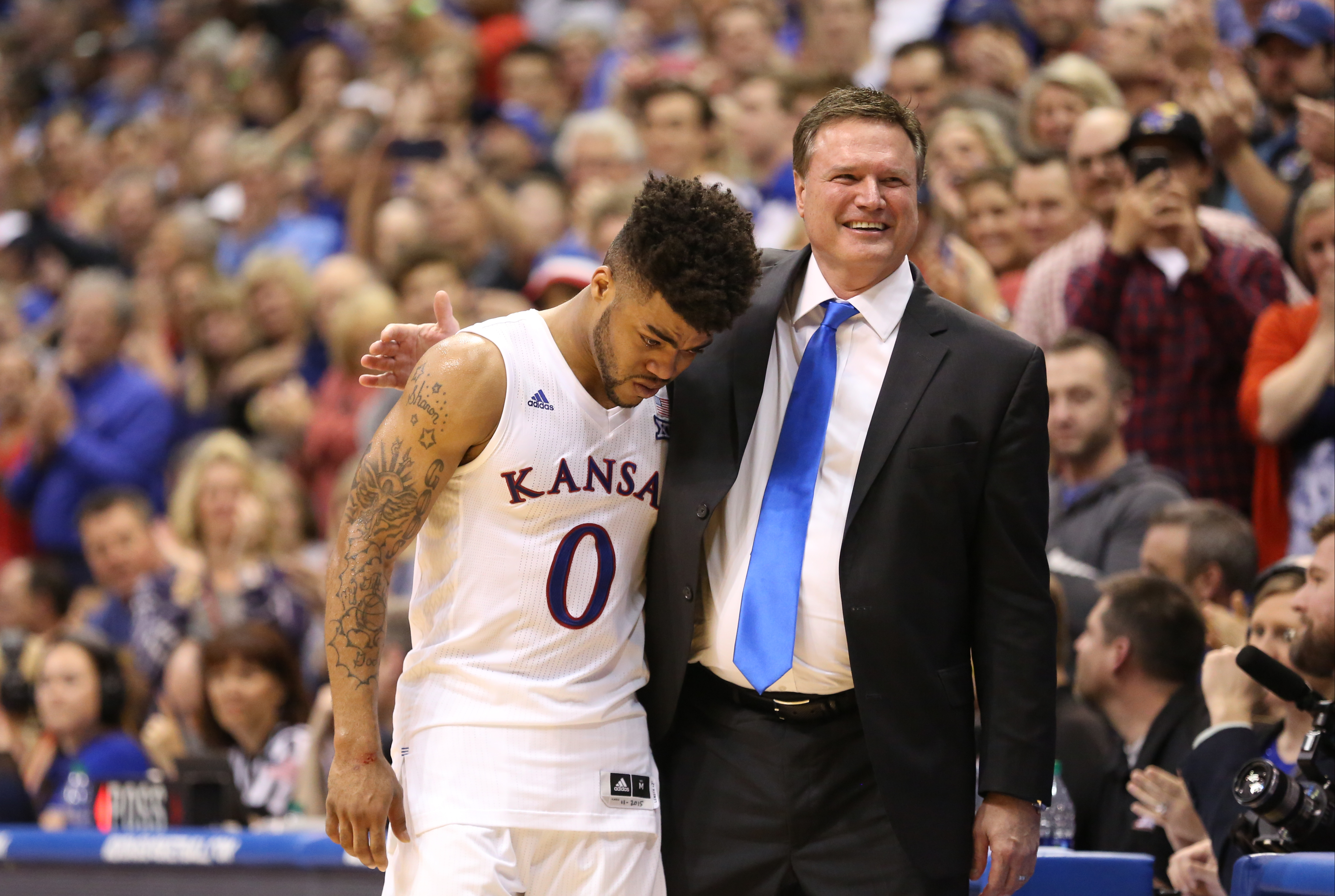 Kansas head coach Bill Self puts his arm around a tearful Kansas guard Frank Mason III (0) as he leaves the court for the final time on Senior Night.