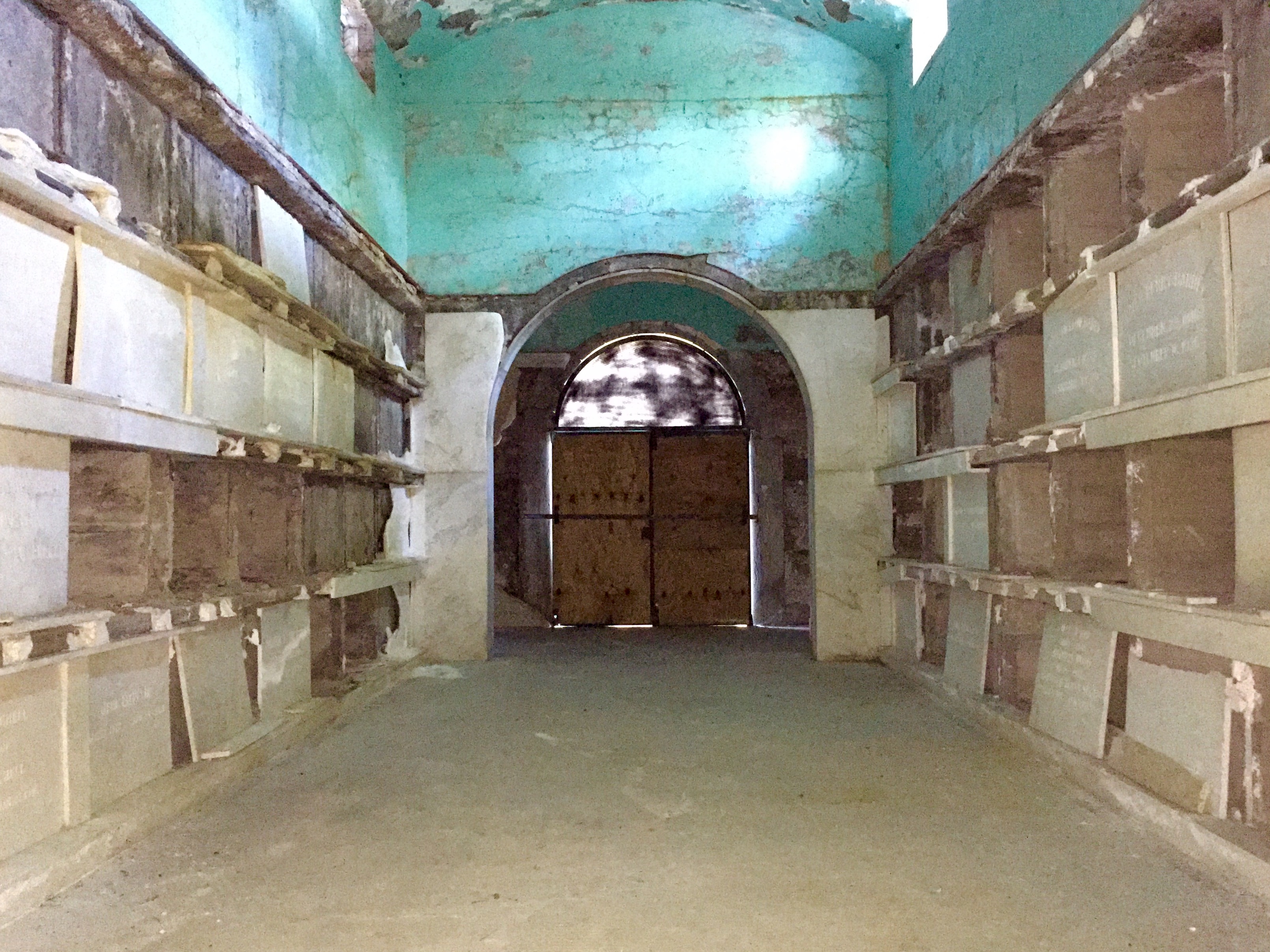 But today, the mausoleum is sealed. The arched windows are filled in. Plywood backs the padlocked entrance. The remaining panels of stained glass, hanging like broken teeth, are hidden behind tinted plexiglass. Inside, the remaining caskets and urns sit behind missing or buckling crypt facings.