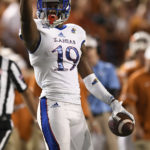Kansas wide receiver Evan Fairs (19) celebrates a completion during first half of an NCAA football game, Saturday, Nov. 11, 2017 in Austin, Texas. (TFV Media via AP)