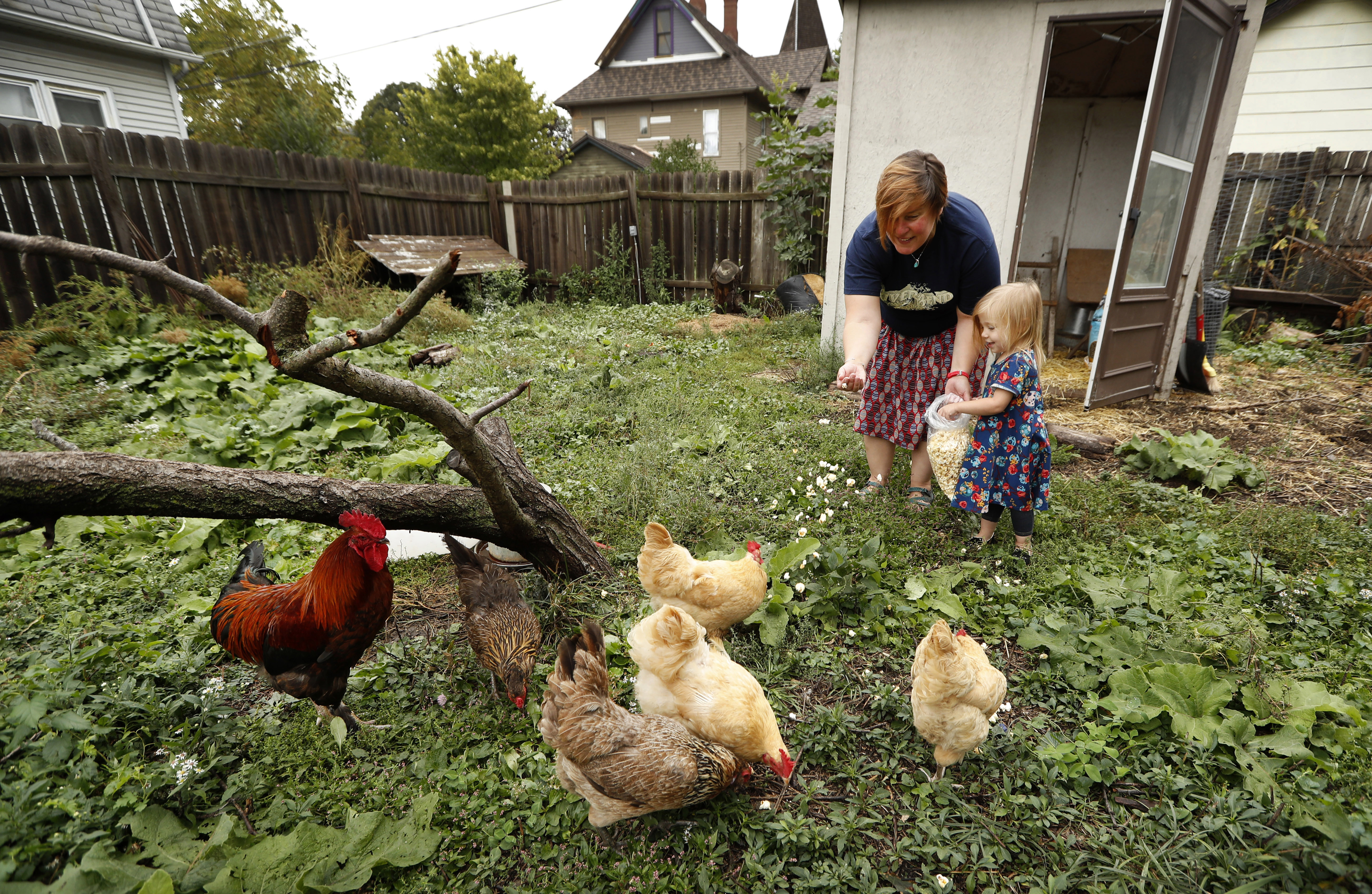 In this Tuesday, Sept. 26, 2017, photo, Tanya Keith, of Des Moines, Iowa, and her daughter Iolana feed their chickens in the backyard of their home, in Des Moines. The trend of raising backyard chickens is causing a soaring number of illnesses from poultry-related diseases. For Keith, the nine hens and a rooster that she keeps behind her home provide fresh eggs and lessons for her three children about where food comes from. But even as her kids collect eggs and help keep the six nesting boxes tidy, she warns them not get too affectionate. (AP Photo/Charlie Neibergall)