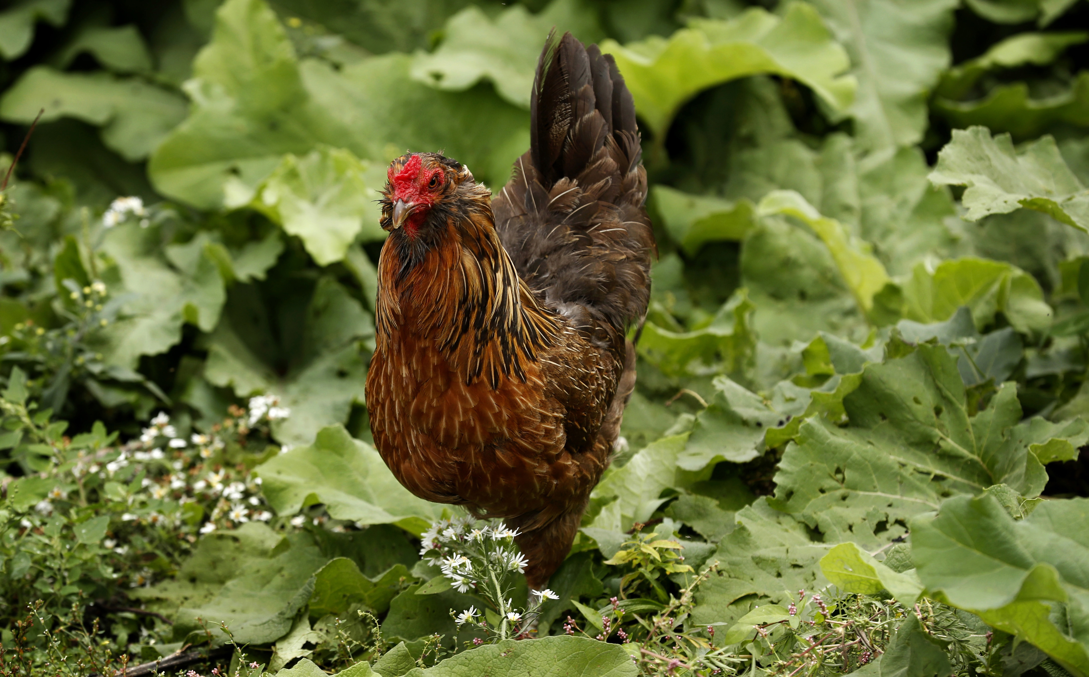 In this Sept. 26, 2017 photo, a rooster walks in the backyard of Tanya Keith's home in Des Moines. A rapid increase in the number of backyard chicken pens in cities and suburbs across the country has brought with it a record number of salmonella illnesses that have public health officials concerned. The U.S. Centers for Disease Control and Prevention says treating chickens like pets contributes to the problem. (AP Photo/Charlie Neibergall)
